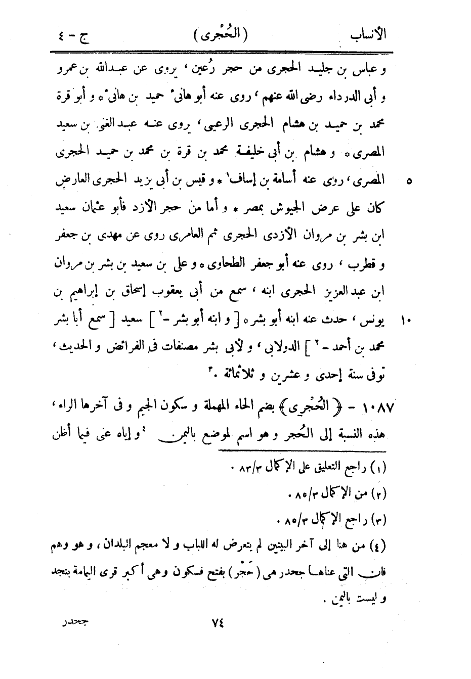 بضم الحاء المهملة وسكون الجيم وفي آخرها الراء، هذه النسبة إلى الحجر وهو اسم لموضع باليمن [4] وإياه عنى فيما أظن