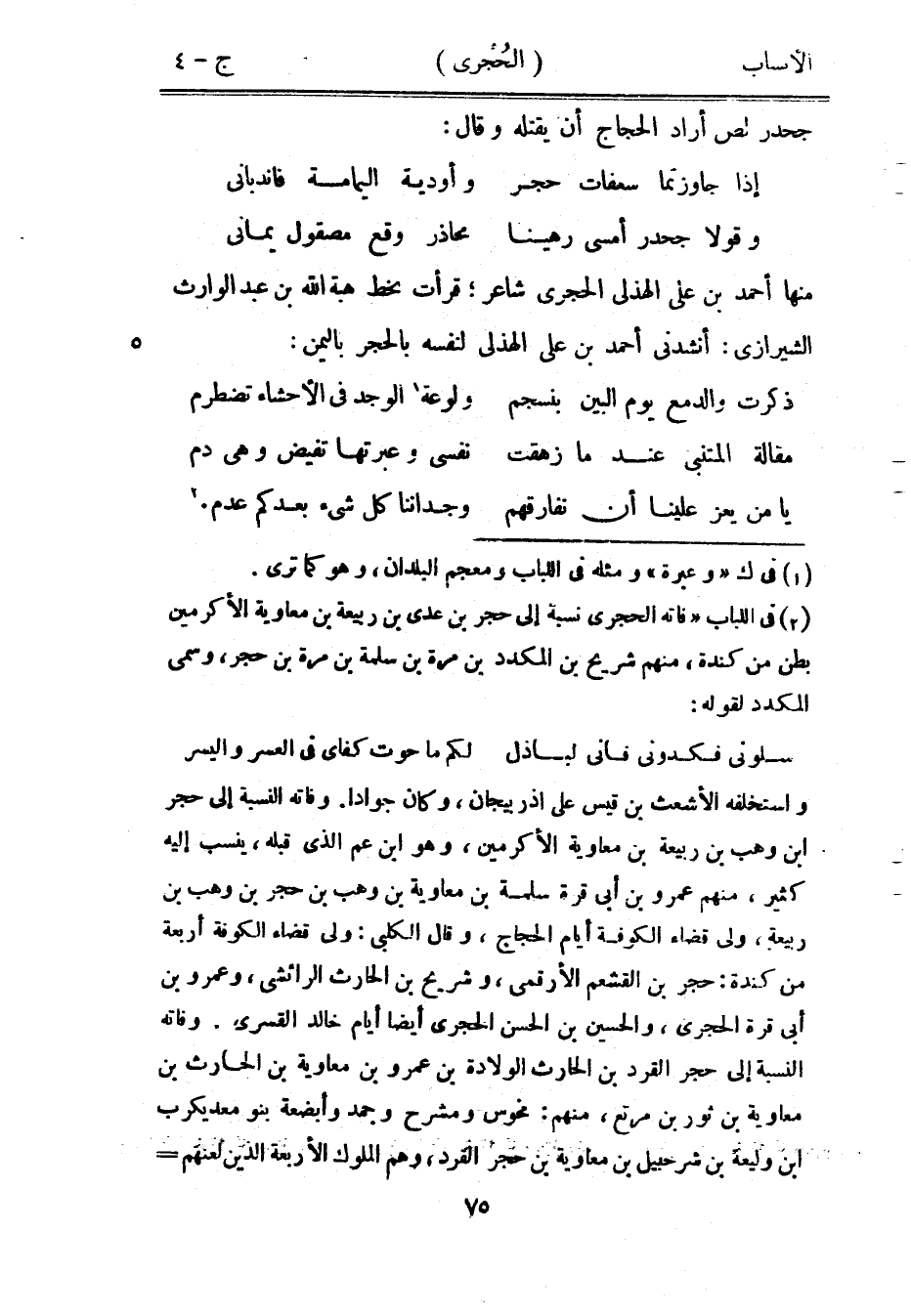 واستخلفه الأشعث بن قيس على آذربيجان، وكان جوادا. وفاته النسبة إلى حجر ابن وهب بن ربيعة بن معاوية الأكرمين، وهو ابن عم الّذي قبله، ينسب إليه كثير، منهم عمرو بن أبى قرة سلمة بن معاوية بن وهب بن حجر بن وهب بن ربيعة، ولى قضاء الكوفة أيام الحجاج، وقال الكلبي: ولى قضاء الكوفة أربعة من كندة: حجر بن القشعم الأرقمي، وشريح بن الحارث الرائشى، وعمرو بن أبى قرة الحجري، والحسين بن الحسن الحجري أيضا أيام خالد القسري. وفاته النسبة إلى حجر القرد بن الحارث الولادة بن عمرو بن معاوية بن الحارث بن معاوية بن ثور بن مرتع، منهم: مخوس ومشرح وجمد وأبضعة بنو معديكرب ابن وليعة بن شرحبيل بن معاوية بن حجر القرد، وهم الملوك الأربعة الذين لعنهم