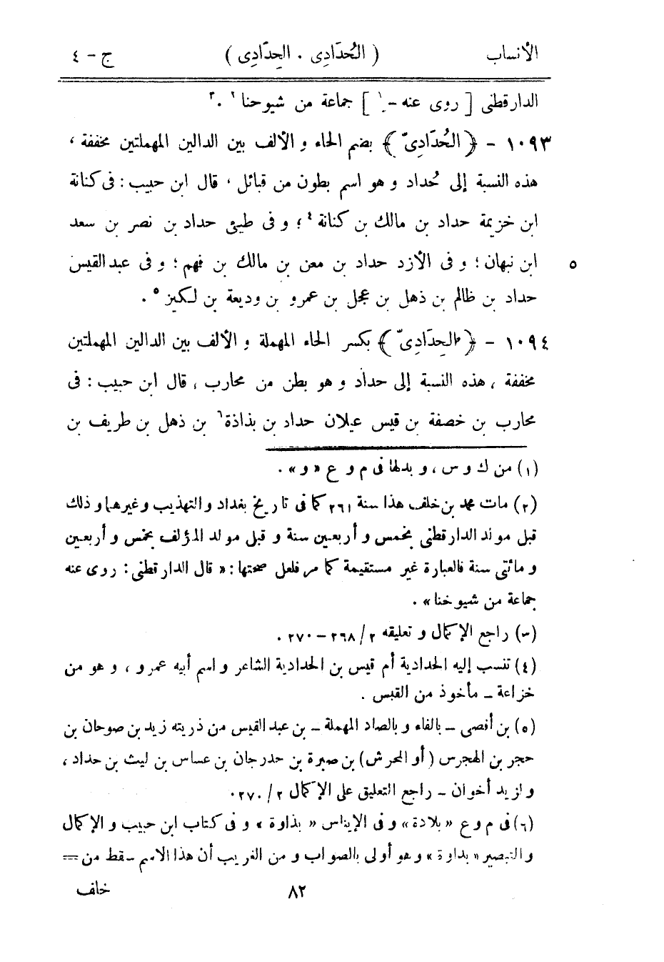 بضم الحاء والألف بين الدالين المهملتين مخففة، هذه النسبة إلى حداد وهو اسم بطون من قبائل، قال ابن حبيب: في كنانة ابن خزيمة حداد بن مالك بن كنانة [4] ، وفي طيِّئ حداد بن نصر بن سعد ابن نبهان، وفي الأزد حداد بن معن بن مالك بن فهم، وفي عبد القيس حداد بن ظالم بن ذهل بن عجل بن عمرو بن وديعة بن لكيز [5] .