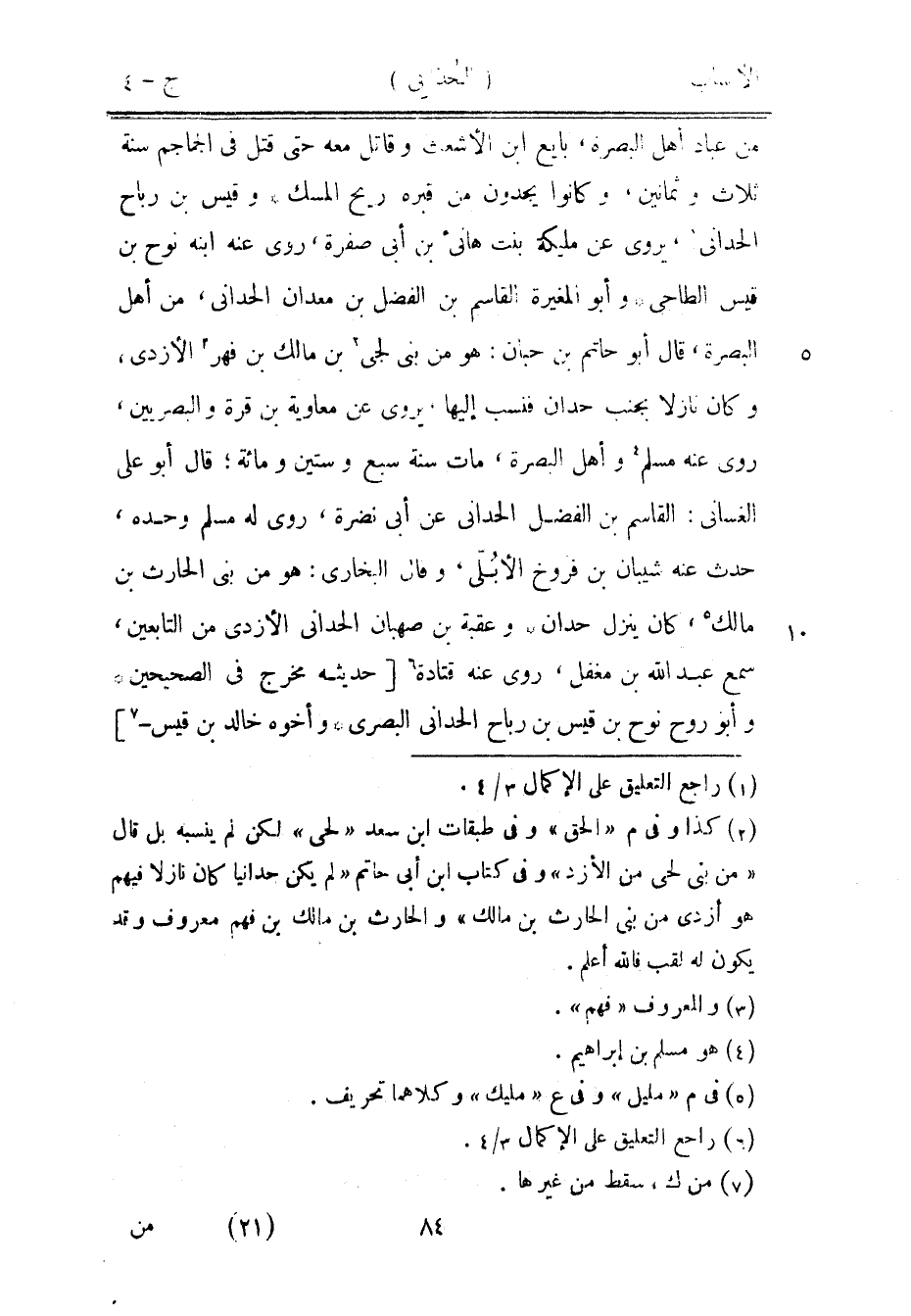 من عباد أهل البصرة، بايع ابن الأشعث وقاتل معه حتى قتل في الجماجم سنة ثلاث وثمانين، وكانوا يجدون من قبره ريح المسك وقيس بن رباح الحدانى [1] ، يروى عن مليكة بنت هانئ بن أبى صفرة، روى عنه ابنه نوح بن قيس الطاحي وأبو المغيرة القاسم بن الفضل بن معدان الحدانى، من أهل البصرة، قال أبو حاتم بن حبان: هو من بنى لجي [2] بن مالك بن فهر [3] الأزدي، وكان نازلا بجنب حدان فنسب إليها، يروى عن معاوية بن قرة والبصريين، روى عنه مسلم [4] وأهل البصرة، مات سنة سبع وستين ومائة، قال أبو على الغساني: القاسم بن الفضل الحدانى عن أبى نضرة، روى له مسلم وحده، حدث عنه شيبان بن فروخ الأبلّي، وقال البخاري: هو من بنى الحارث بن مالك [5] ، كان ينزل حدان وعقبة بن صهبان الحدانى الأزدي من التابعين، سمع عبد الله بن مغفل، روى عنه قتادة [6] [حديثه مخرج في الصحيحين وأبو روح نوح بن قيس بن رباح الحدانى البصري وأخوه خالد بن قيس-[7]]