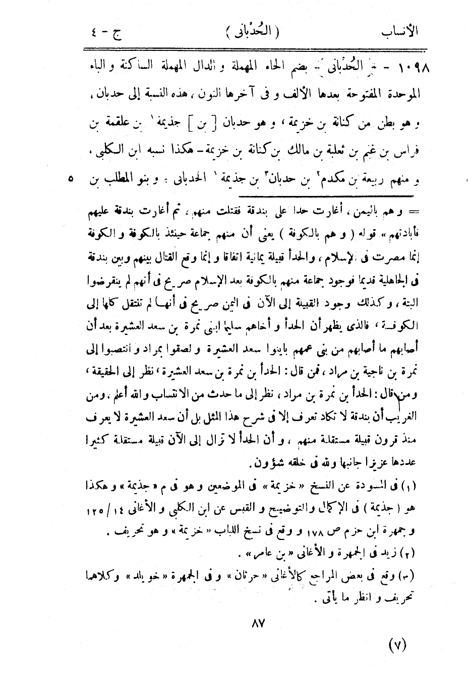 [ () ] وهم باليمن، أغارت حدا على بندقة فقتلت منهم، ثم أغارت بندقة عليهم فأبادتهم» قوله (وهم بالكوفة) يعنى أن منهم جماعة حينئذ بالكوفة والكوفة إنما مصرت في الإسلام، والحدأ قبيلة يمانية اتفاقا وإنما وقع القتال بينهم وبين بندقة في الجاهلية قديما فوجود جماعة منهم بالكوفة بعد الإسلام صريح في أنهم لم ينقرضوا البتة، وكذلك وجود القبيلة إلى الآن في اليمن صريح في أنها لم تنتقل كلها إلى الكوفة، فالذي يظهر أن الحدأ وأخاهم سليما ابني نمرة بن سعد العشيرة بعد أن أصابهم ما أصابهم من بنى عمهم باينوا سعد العشيرة ولصقوا بمراد وانتصبوا إلى نمرة بن ناجية بن مراد، فمن قال: الحدأ بن نمرة بن سعد العشيرة، نظر إلى الحقيقة، ومن قال: الحدأ بن نمرة بن مراد، نظر إلى ما حدث من الانتساب والله أعلم، ومن الغريب أن بندقة لا تكاد تعرف إلا في شرح هذا المثل بل أن سعد العشيرة لا يعرف منذ قرون قبيلة مستقلة منهم، وأن الحدأ لا تزال إلى الآن قبيلة مستقلة كثيرا عددها عزيزا جانبها وللَّه في خلقه شئون.