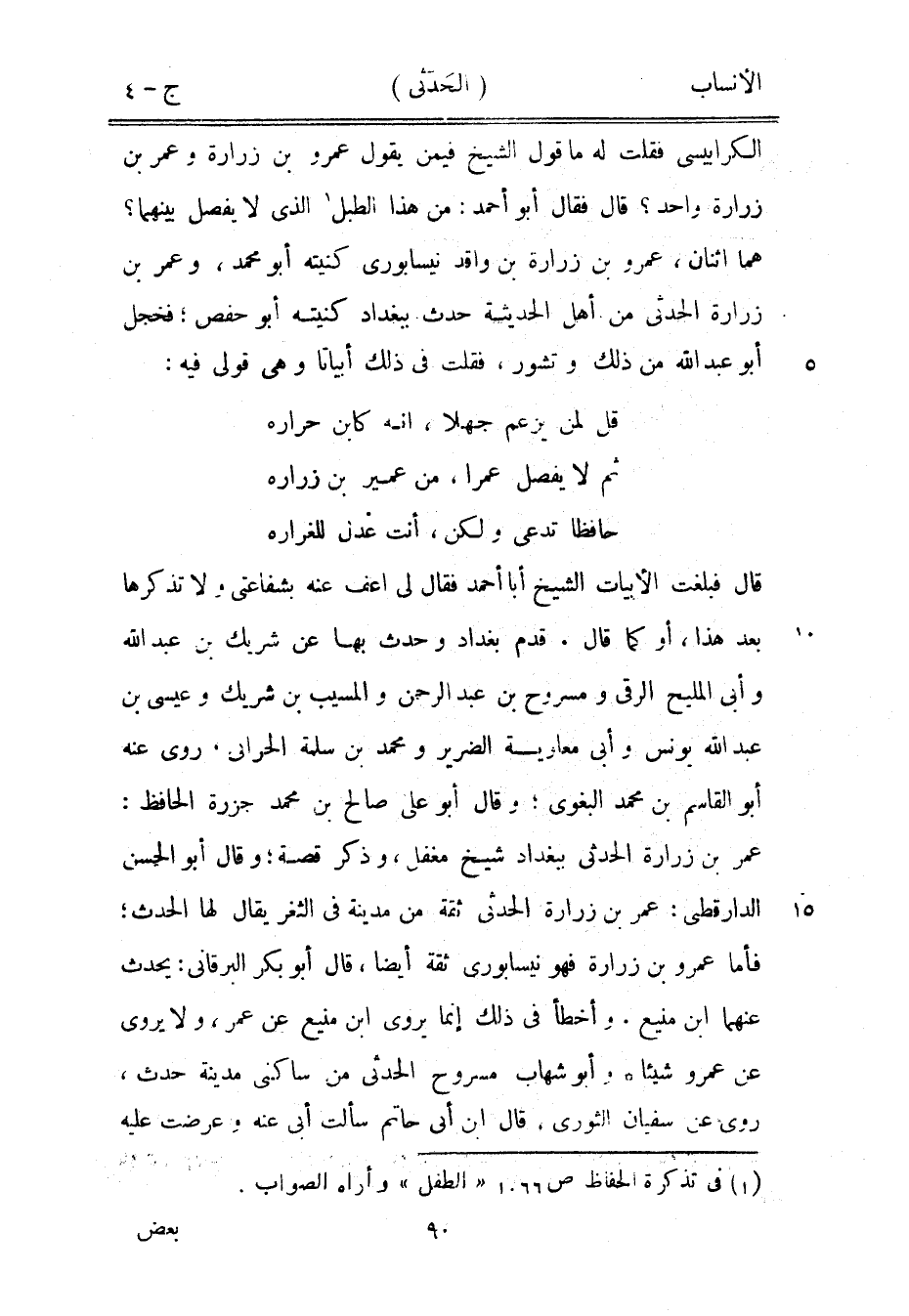 الكرابيسي فقلت له ما قول الشيخ فيمن يقول عمرو بن زرارة وعمر بن زرارة واحد؟ قال فقال أبو أحمد: من هذا الطبل [1] الّذي لا يفصل بينهما؟