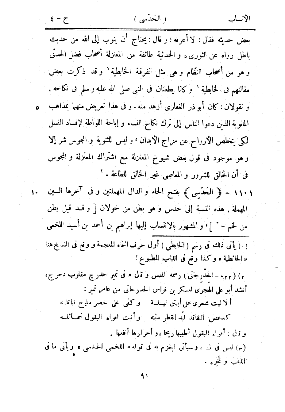 بعض حديثه فقال: لا أعرفه، وقال: يحتاج أن يتوب إلى الله من حديث باطل رواه عن الثوري والحدثية طائفة من المعتزلة أصحاب فضل الحدثى وهو من أصحاب النظام وهي مثل الفرقة الخابطية [1] وقد ذكرت بعض مقالتهم في الخابطية [1] وكانا يطعنان في النبي صلى الله عليه وسلم في نكاحه، وتقولان: كان أبو ذر الغفاريّ أزهد منه. وفي هذا تعريض منهما بمذاهب المانوية الذين دعوا الناس إلى ترك نكاح النساء وإباحة اللواطة لإفساد النسل لكي يتخلص الأرواح عن مزاج الأبدان، وليس للثنوية والمجوس شر إلا وهو موجود في قول بعض شيوخ المعتزلة مع اشتراك المعتزلة والمجوس في أن الخالق للشرور والمعاصي غير الخالق للطاعة. [2]