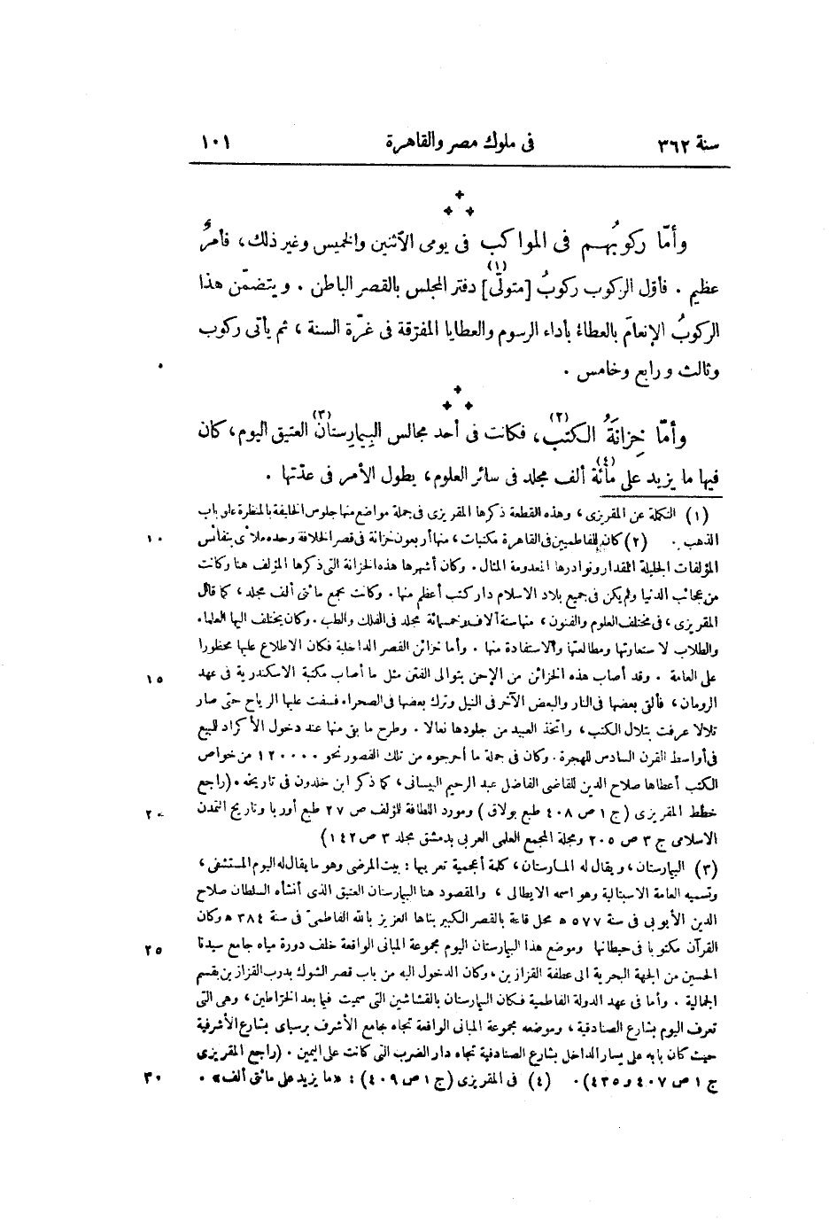 *** وأمّا خزانة الكتب «2» ، فكانت في أحد مجالس البيمارستان «3» العتيق اليوم، كان فيها ما يزيد على مائة «4» ألف مجلد في سائر العلوم، يطول الأمر في عدّتها.