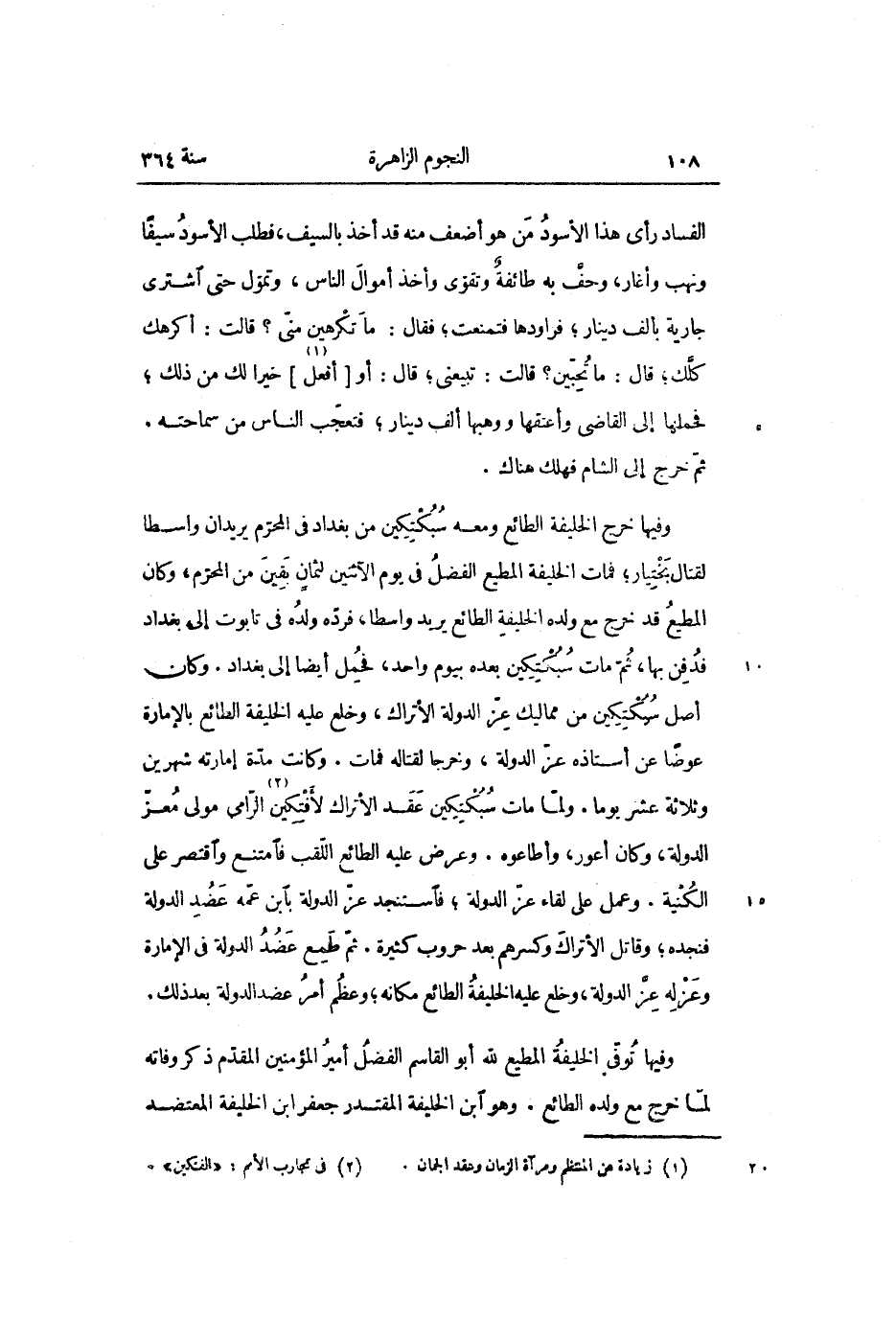 وفيها توفّى الخليفة المطيع لله أبو القاسم الفضل أمير المؤمنين المقدّم ذكر وفاته لمّا خرج مع ولده الطائع. وهو ابن الخليفة المقتدر جعفر ابن الخليفة المعتضد