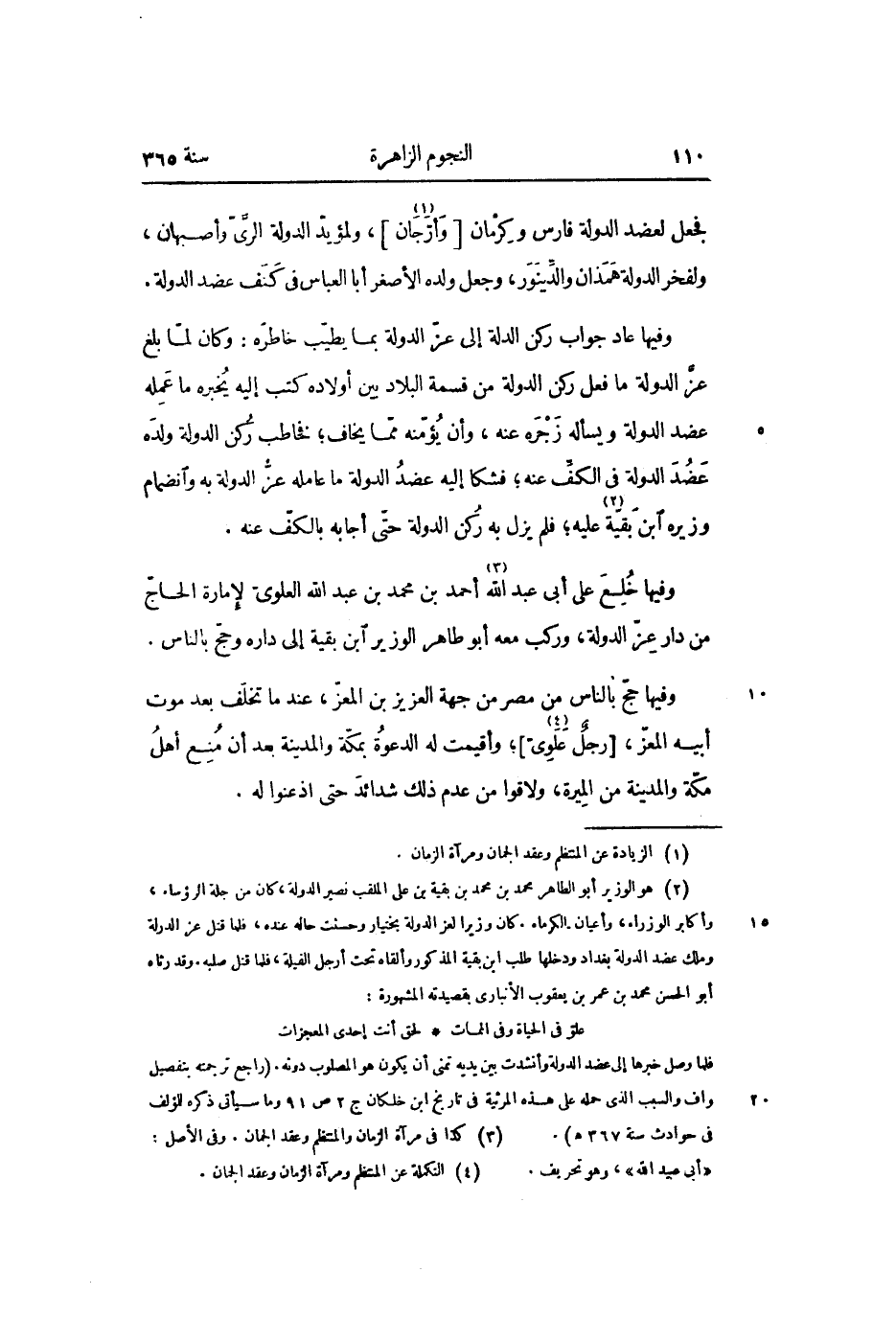وفيها عاد جواب ركن الدولة إلى عزّ الدولة بما يطيّب خاطره: وكان لمّا بلغ عزّ الدولة ما فعل ركن الدولة من قسمة البلاد بين أولاده كتب إليه يخبره ما عمله عضد الدولة ويسأله زجره عنه، وأن يؤمّنه ممّا يخاف؛ فخاطب ركن الدولة ولده عضد الدولة في الكفّ عنه؛ فشكا إليه عضد الدولة ما عامله عزّ الدولة به وانضمام وزيره ابن بقيّة «2» عليه؛ فلم يزل به ركن الدولة حتّى أجابه بالكفّ عنه.