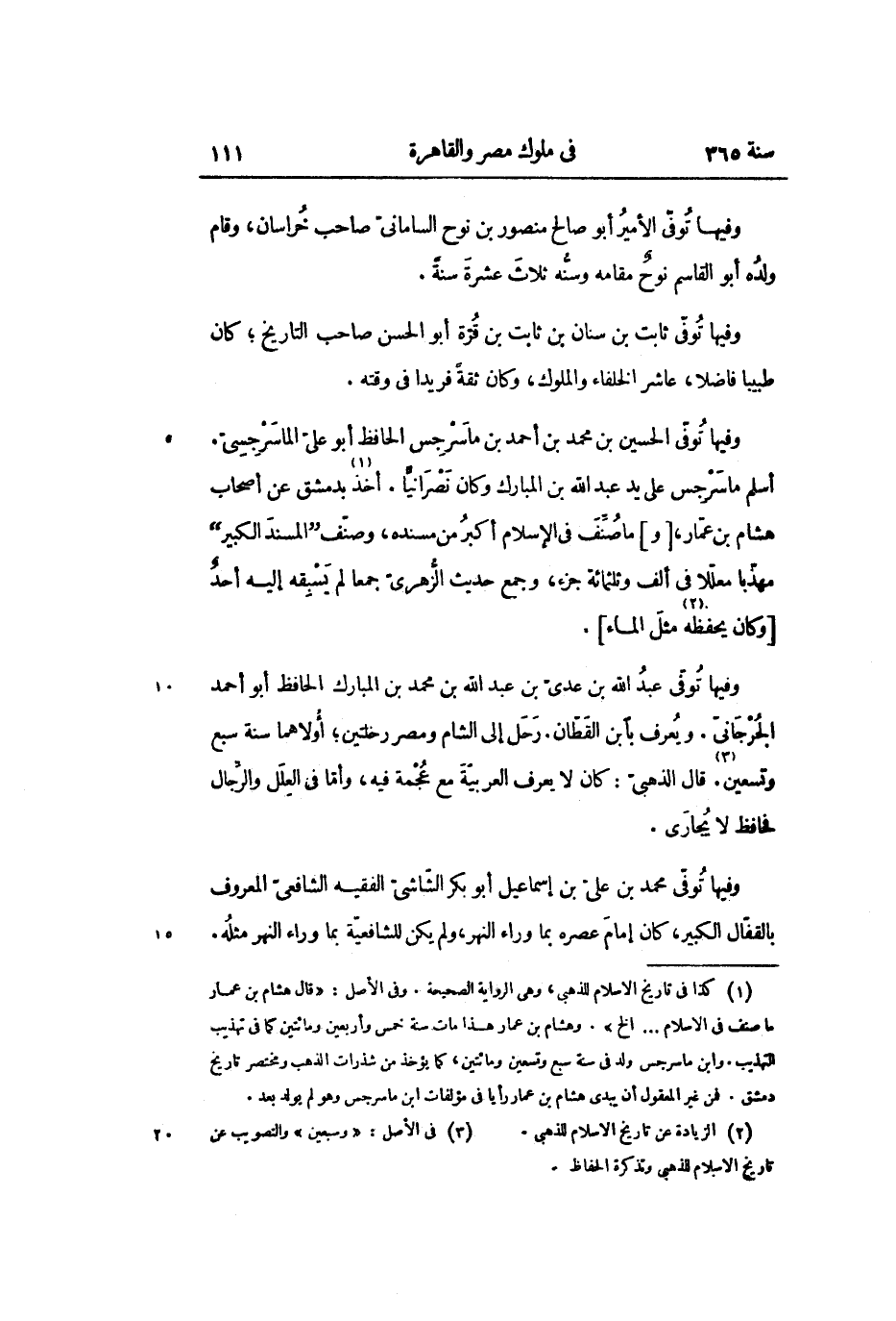 وفيها توفّى عبد الله بن عدىّ بن عبد الله بن محمد بن المبارك الحافظ أبو أحمد الجرجانىّ. ويعرف بابن القطّان. رحل إلى الشام ومصر رحلتين؛ أولاهما سنة سبع وتسعين «3» . قال الذهبىّ: كان لا يعرف العربية مع عجمة فيه، وأمّا في العلل والرّجال فحافظ لا يجارى.