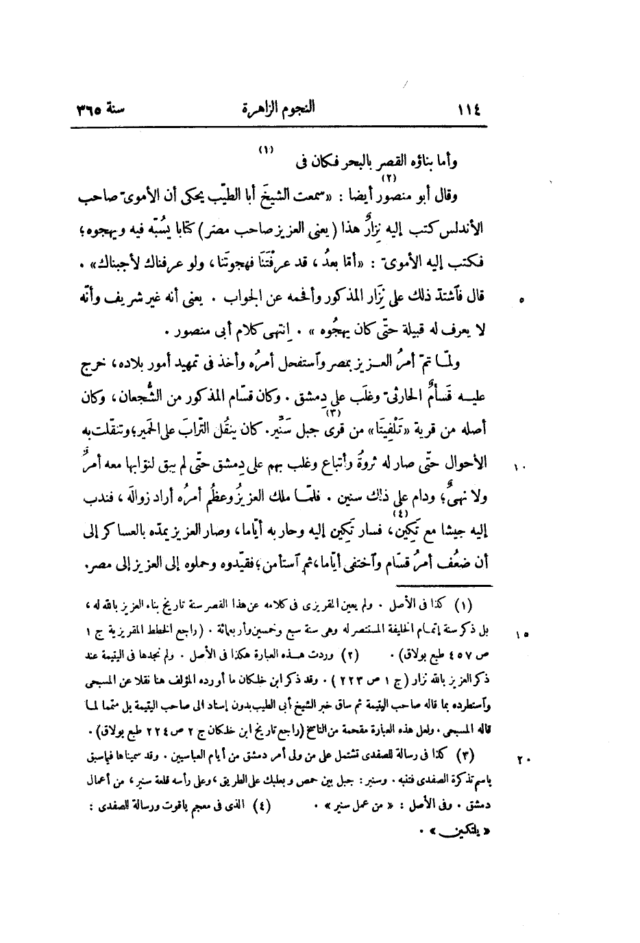 ولمّا تمّ أمر العزيز بمصر واستفحل أمره وأخذ في تمهيد أمور بلاده، خرج عليه قسأم الحارثىّ وغلب على دمشق. وكان قسّام المذكور من الشّجعان، وكان أصله من قرية «تلفيتا» من قرى «3» جبل سنّير. كان ينقل التّراب على الحمير؛ وتنقّلت به الأحوال حتّى صار له ثروة وأتباع وغلب بهم على دمشق حتّى لم يبق لنوّابها معه أمر ولا نهى؛ ودام على ذلك سنين. فلمّا ملك العزيز وعظم أمره أراد زواله، فندب إليه جيشا مع تكين «4» ، فسار تكين إليه وحاربه أيّاما، وصار العزيز يمدّه بالعساكر إلى أن ضعف أمر قسّام واختفى أيّاما، ثم استأمن؛ فقيّدوه وحملوه إلى العزيز إلى مصر.
