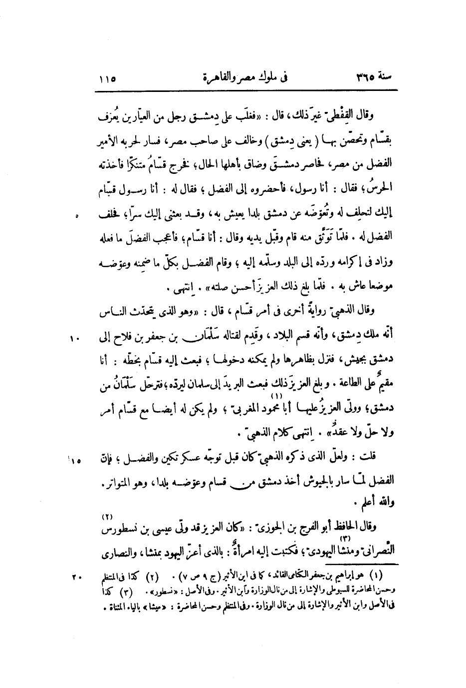 قلت: ولعلّ الذي ذكره الذهبىّ كان قبل توجّه عسكرتكين والفضل؛ فإنّ الفضل لمّا سار بالجيوش أخذ دمشق من قسام وعوّضه بلدا، وهو المتواتر.
