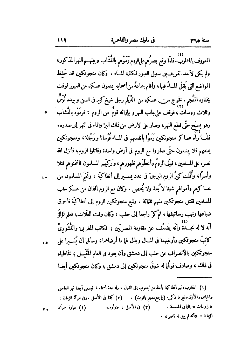 فلمّا رآه «3» عساكر منجوتكين رموا بأنفسهم في الماء فرسانا ورجّالة، ومنجوتكين يمنعهم فلا يمتنعون حتّى صاروا مع الروم في أرض واحدة وقاتلوا الروم؛ فأنزل الله نصره على المسلمين، فولّى الروم وأعطوهم ظهورهم، وركبهم المسلمون فاثخنوهم قتلا وأسرا، وأفلت كبير الروم البرجىّ في عدد يسير إلى أنطاكية، وغنم المسلمون من عساكرهم وأموالهم شيئا لا يعدّ ولا يحصى. وكان مع الروم ألفان من عسكر حلب المسلمين فقتل منجوتكين منهم ثلثمائة. وتبع منجوتكين الروم إلى أنطاكية فأحرق ضياعها ونهب رساتيقها، ثمّ كرّ راجعا إلى حلب، وكان وقت الغلّات؛ فعلم لؤلؤ أنّه لا له نجدة «4» وأنّه يضعف عن مقاومة المصريّين؛ فكاتب المغربىّ والنّشورىّ كاتب منجوتكين وأرغبهما في المال وبذل لهما ما أرضاهما، وسألهما أن يشيرا على منجوتكين بالانصراف عن حلب إلى دمشق وأن يعود في العام المقبل؛ فخاطباه فى ذلك، وصادف قولهما له شوق منجوتكين إلى دمشق؛ وكان منجوتكين أيضا