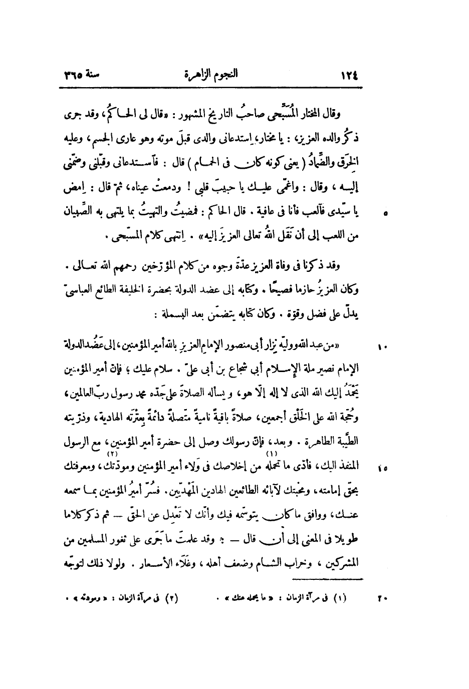 «من عبد الله ووليّه نزار أبى منصور الإمام العزيز بالله أمير المؤمنين، إلى عضد الدولة الإمام نصير ملة الإسلام أبى شجاع بن أبى علىّ. سلام عليك؛ فإنّ أمير المؤمنين يحمد إليك الله الذي لا إله إلّا هو، ويسأله الصّلاة على جدّه محمد رسول ربّ العالمين، وحجّة الله على الخلق أجمعين، صلاة باقية نامية متّصلة دائمة بعترته الهادية، وذرّيته الطيّبة الطاهرة. وبعد، فإنّ رسولك وصل إلى حضرة أمير المؤمنين، مع الرسول المنفذ اليك، فأدّى ما تحمله «1» من إخلاصك في ولاء أمير المؤمنين ومودّتك «2» ، ومعرفتك بحقّ إمامته، ومحبتك لآبائه الطائعين الهادين المهديّين. فسرّ أمير المؤمنين بما سمعه عنك، ووافق ما كان يتوسّمه فيك وأنّك لا تعدل عن الحقّ- ثم ذكر كلاما طويلا في المعنى إلى أن قال-: وقد علمت ما جرى على ثغور المسلمين من المشركين، وخراب الشام وضعف أهله، وغلاء الأسعار. ولولا ذلك لتوجّه