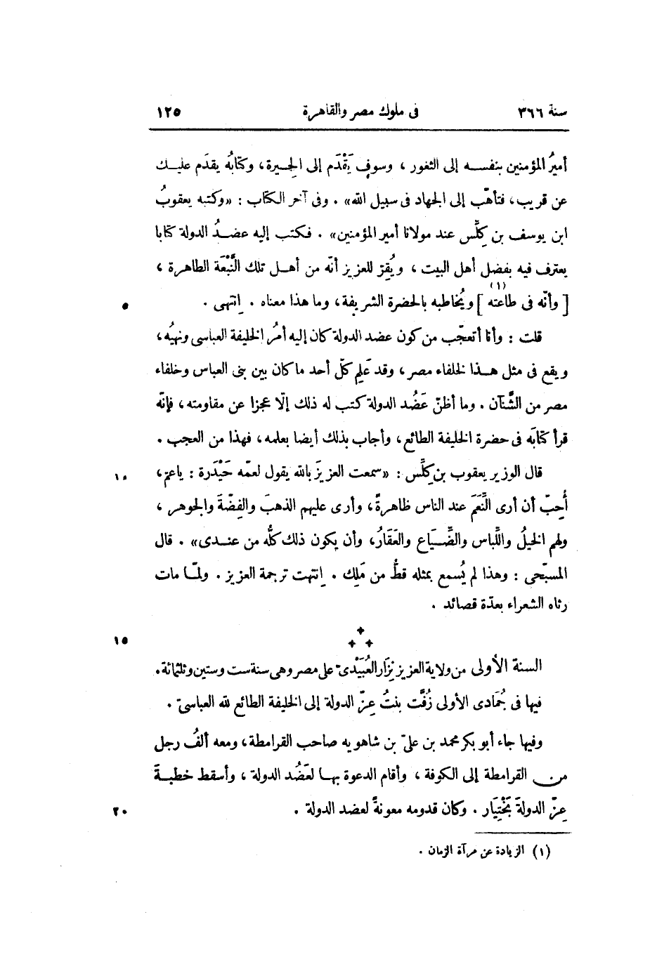 أمير المؤمنين بنفسه إلى الثغور، وسوف يقدم إلى الحيرة، وكتابه يقدم عليك عن قريب، فتأهّب إلى الجهاد في سبيل الله» . وفي آخر الكتاب: «وكتبه يعقوب ابن يوسف بن كلّس عند مولانا أمير المؤمنين» . فكتب إليه عضد الدولة كتابا يعترف فيه بفضل أهل البيت، ويقرّ للعزيز أنّه من أهل تلك النّبعة الطاهرة، [وأنّه في طاعته «1» ] ويخاطبه بالحضرة الشريفة، وما هذا معناه. انتهى.