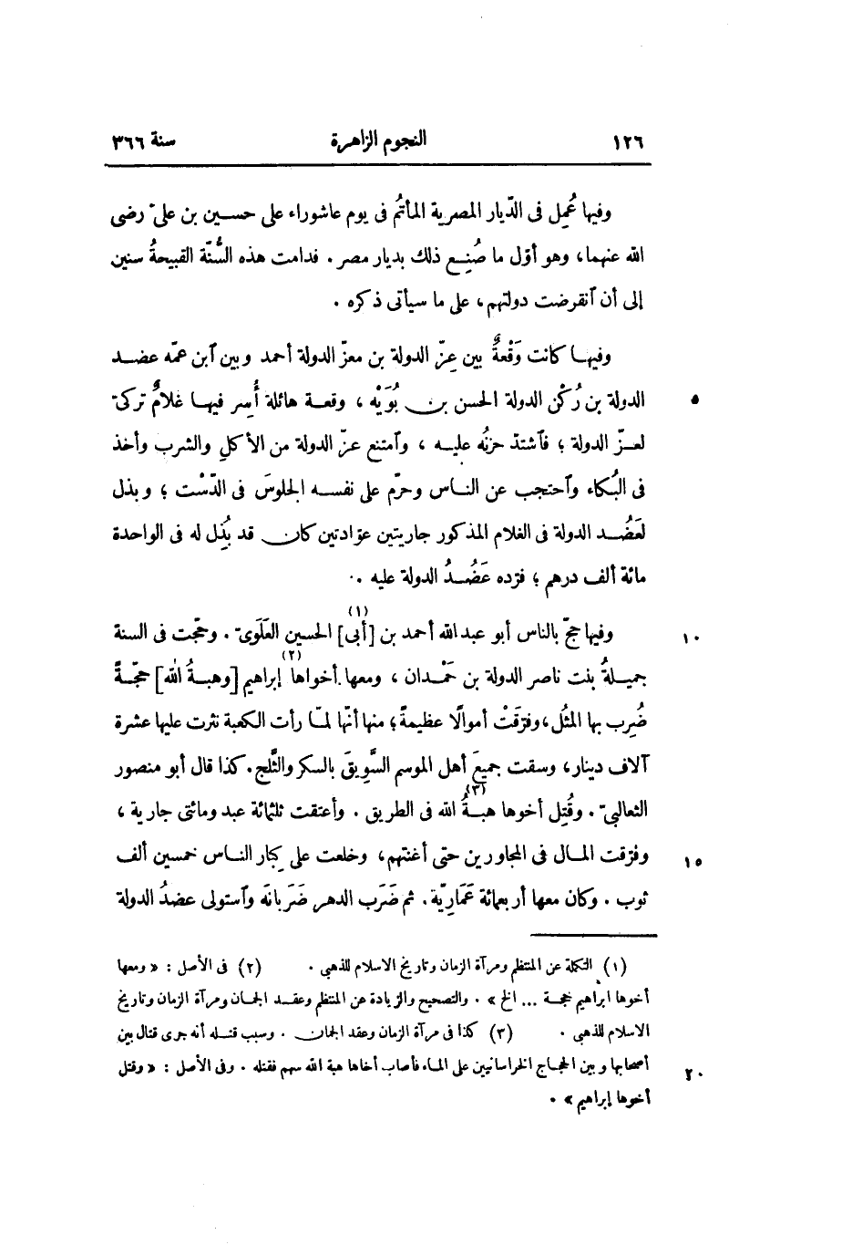 وفيها حجّ بالناس أبو عبد الله أحمد بن [أبى «1» ] الحسين العلوىّ. وحجّت في السنة جميلة بنت ناصر الدولة بن حمدان، ومعها أخواها «2» إبراهيم [وهبة الله] حجّة ضرب بها المثل، وفرّقت أموالا عظيمة؛ منها أنّها لمّا رأت الكعبة نثرت عليها عشرة آلاف دينار، وسقت جميع أهل الموسم السّويق بالسكر والثّلج. كذا قال أبو منصور الثعالبىّ. وقتل أخوها هبة «3» الله في الطريق. وأعتقت ثلثمائة عبد ومائتى جارية، وفرّقت المال في المجاورين حتى أغنتهم، وخلعت على كبار الناس خمسين ألف ثوب. وكان معها أربعمائة عماريّة. ثم ضرب الدهر ضربانه واستولى عضد الدولة