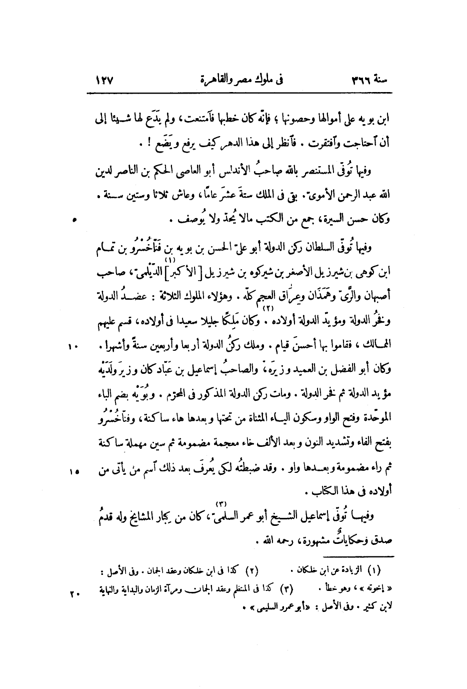وكان أبو الفضل بن العميد وزيره، والصاحب إسماعيل بن عبّاد كان وزير ولديه مؤيد الدولة ثم فخر الدولة. ومات ركن الدولة المذكور في المحرّم. وبويه بضم الباء الموحّدة وفتح الواو وسكون الياء المثناة من تحتها وبعدها هاء ساكنة، وفنّاخسرو بفتح الفاء وتشديد النون وبعد الألف خاء معجمة مضمومة ثم سين مهملة ساكنة ثم راء مضمومة وبعدها واو. وقد ضبطته لكى يعرف بعد ذلك اسم من يأتى من أولاده في هذا الكتاب.