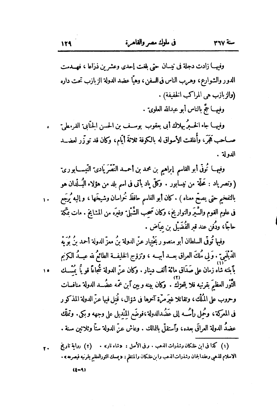 وفيها توفّى السلطان أبو منصور بختيار عزّ الدولة بن معزّ الدولة أحمد بن بويه الدّيلمىّ. ولى ملك العراق بعد أبيه، وتزوّج الخليفة الطائع لله عبد الكريم بابنته شاه «1» زمان على صداق مائة ألف دينار. وكان عزّ الدولة شجاعا قويّا يمسك الثّور العظيم بقرنيه فلا يتحرّك «2» . وكان بينه وبين ابن عمّه عضد الدولة منافسات وحروب على الملك، وتقاتلا غير مرّة آخرها في شوّال، قتل فيها عزّ الدولة المذكور فى المعركة، وحمل رأسه إلى عضد الدولة، فوضع المنديل على وجهه وبكى. وتملّك عضد الدولة العراق بعده، واستقلّ بالممالك. وعاش عزّ الدولة ستّا وثلاثين سنة.