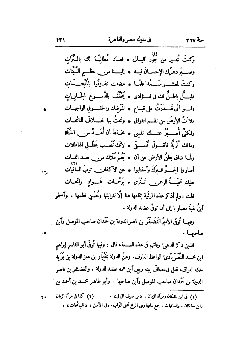 قلت: ولم أذكر هذه المرثية بتمامها هنا إلّا لغرابتها وحسن نظمها. واستمر ابن بقيّة مصلوبا إلى أن توفّى عضد الدولة.