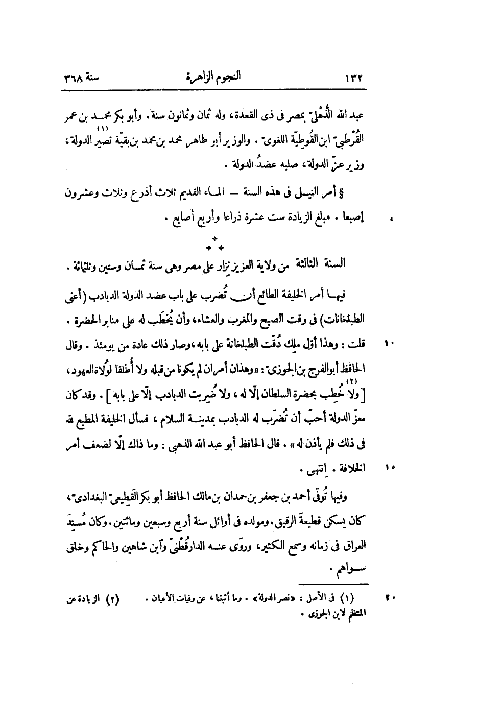 قلت: وهذا أوّل ملك دقّت الطبلخانة على بابه، وصار ذلك عادة من يومئذ. وقال الحافظ أبو الفرج بن الجوزىّ: «وهذان أمران لم يكونا من قبله ولا أطلقا لولاة العهود، [ولا «2» خطب بحضرة السلطان إلّا له، ولا ضربت الدبادب إلّا على بابه] . وقد كان معزّ الدولة أحبّ أن تضرب له الدبادب بمدينة السلام، فسأل الخليفة المطيع لله فى ذلك فلم يأذن له» . قال الحافظ أبو عبد الله الذهبى: وما ذاك إلّا لضعف أمر الخلافة. انتهى.