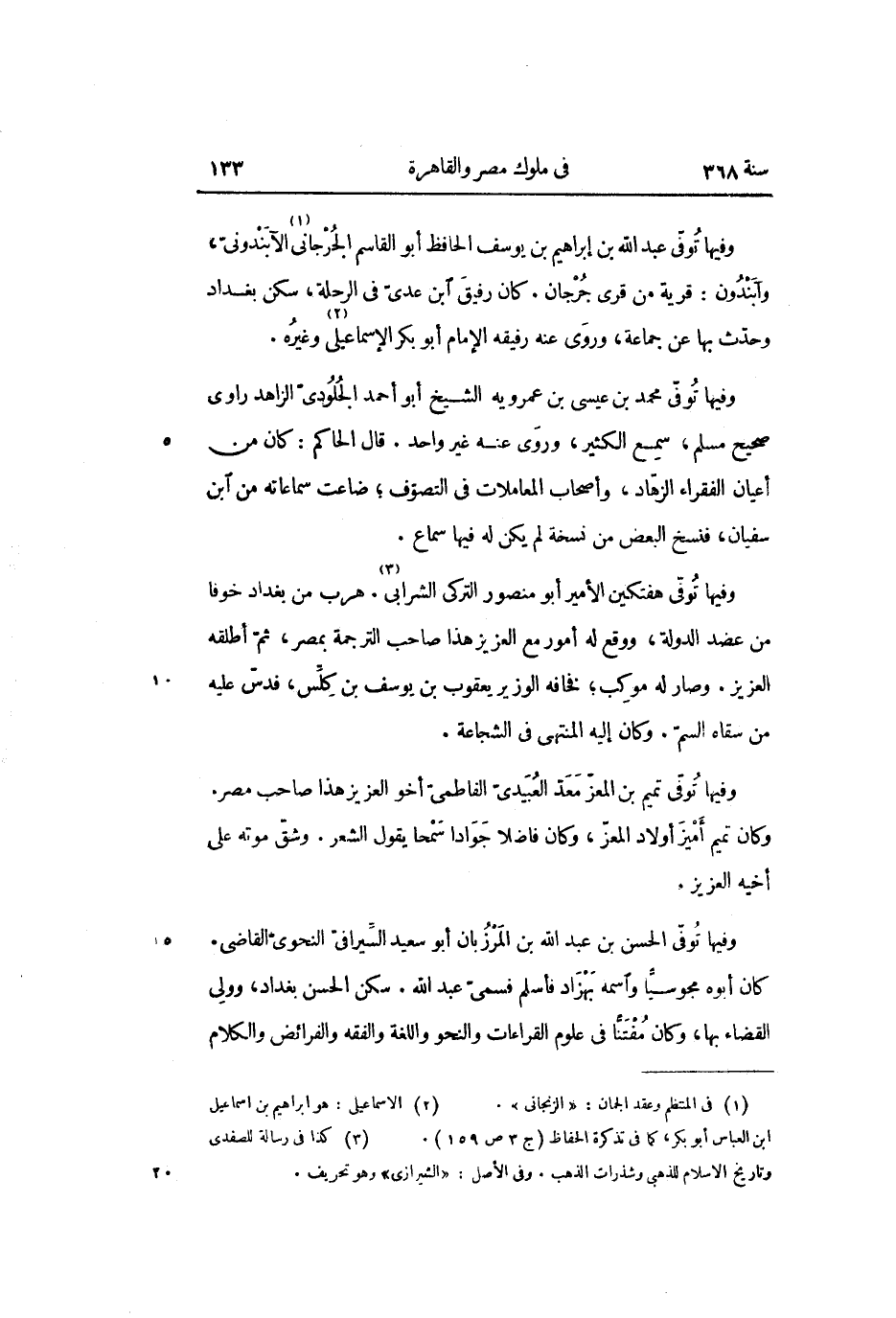 وفيها توفّى عبد الله بن إبراهيم بن يوسف الحافظ أبو القاسم الجرجانى «1» الآبندونىّ، وآبندون: قرية من قرى جرجان. كان رفيق ابن عدىّ في الرحلة، سكن بغداد وحدّث بها عن جماعة، وروى عنه رفيقه الإمام أبو بكر الإسماعيلى «2» وغيره.