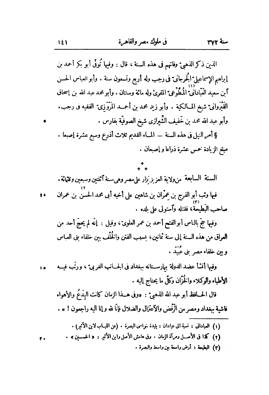 فيها وثب أبو الفرج بن عمران بن شاهين على أخيه أبى محمد الحسن «2» بن عمران صاحب البطيحة «3» ، فقتله واستولى على بلده.