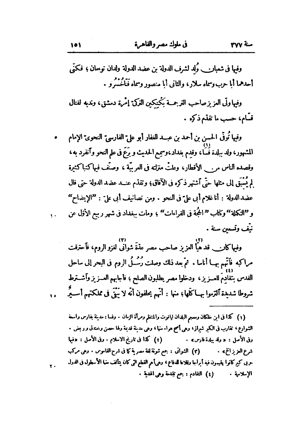 وفيها توفّى الحسن بن أحمد بن عبد الغفار أبو علىّ الفارسىّ النحوىّ الإمام المشهور، ولد ببلدة فسا «1» ، وقدم بغداد، وسمع الحديث وبرع في علم النحو وانفرد به، وقصده الناس من الأقطار، وعلت منزلته في العربيّة، وصنّف فيها كتبا كثيرة لم يسبق إلى مثلها حتّى اشتهر ذكره في الآفاق؛ وتقدّم عند عضد الدولة حتى قال عضد الدولة: أنا غلام أبى علىّ في النحو. ومن تصانيف أبى علىّ:" الإيضاح" و" التكملة" وكتاب" الحجة في القراءات"؛ ومات ببغداد في شهر ربيع الأوّل عن نيّف وتسعين سنة.