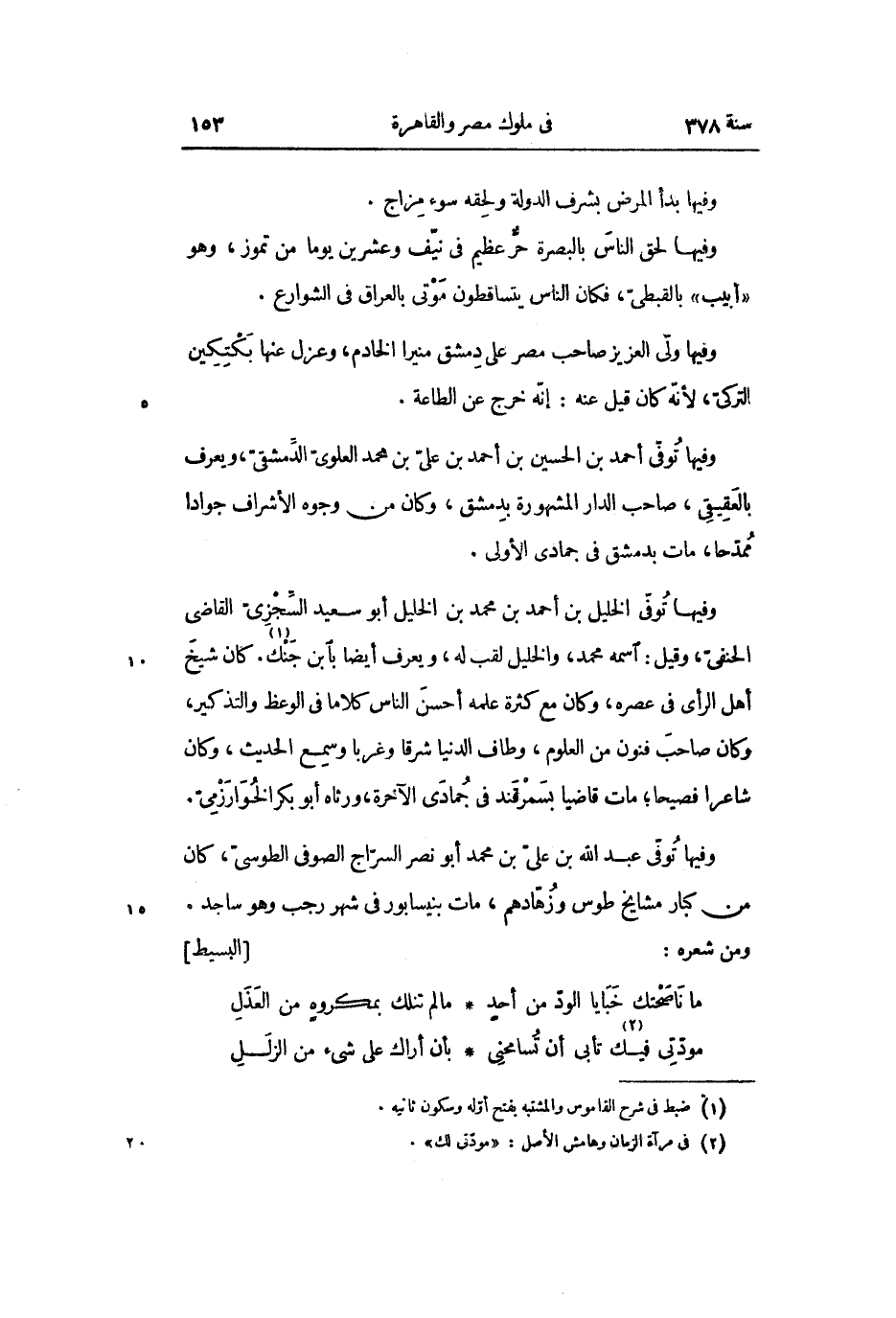 وفيها توفّى عبد الله بن علىّ بن محمد أبو نصر السرّاج الصوفى الطوسىّ، كان من كبار مشايخ طوس وزهّادهم، مات بنيسابور في شهر رجب وهو ساجد.