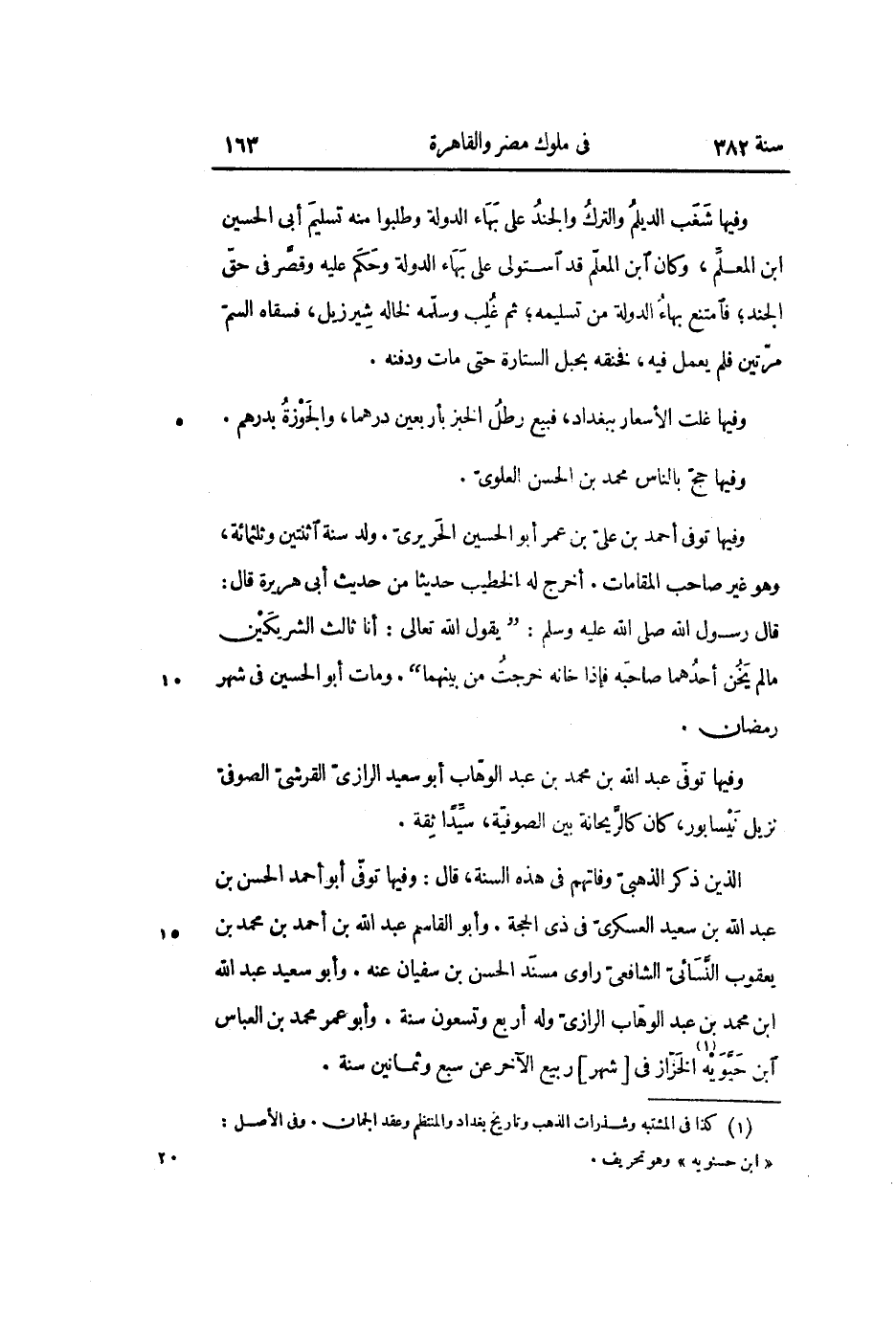 الذين ذكر الذهبىّ وفاتهم في هذه السنة، قال: وفيها توفّى أبو أحمد الحسن بن عبد الله بن سعيد العسكرىّ في ذى الحجة. وأبو القاسم عبد الله بن أحمد بن محمد بن يعقوب النّسائىّ الشافعىّ راوى مسند الحسن بن سفيان عنه. وأبو سعيد عبد الله ابن محمد بن عبد الوهّاب الرازىّ وله أربع وتسعون سنة. وأبو عمر محمد بن العباس ابن حيّويه «1» الخزّاز في [شهر] ربيع الآخر عن سبع وثمانين سنة.