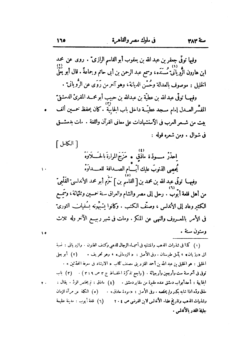 وفيها توفّى عبد الله بن عطيّة بن عبد الله بن حبيب أبو محمد المقرئ الدمشقىّ المفسّر العدل إمام مسجد عطيّة داخل باب الجابية «3» . كان يحفظ خمسين ألف بيت من شعر العرب في الاستشهادات على معانى القرآن واللغة. مات بدمشق فى شوال. ومن شعره قوله: