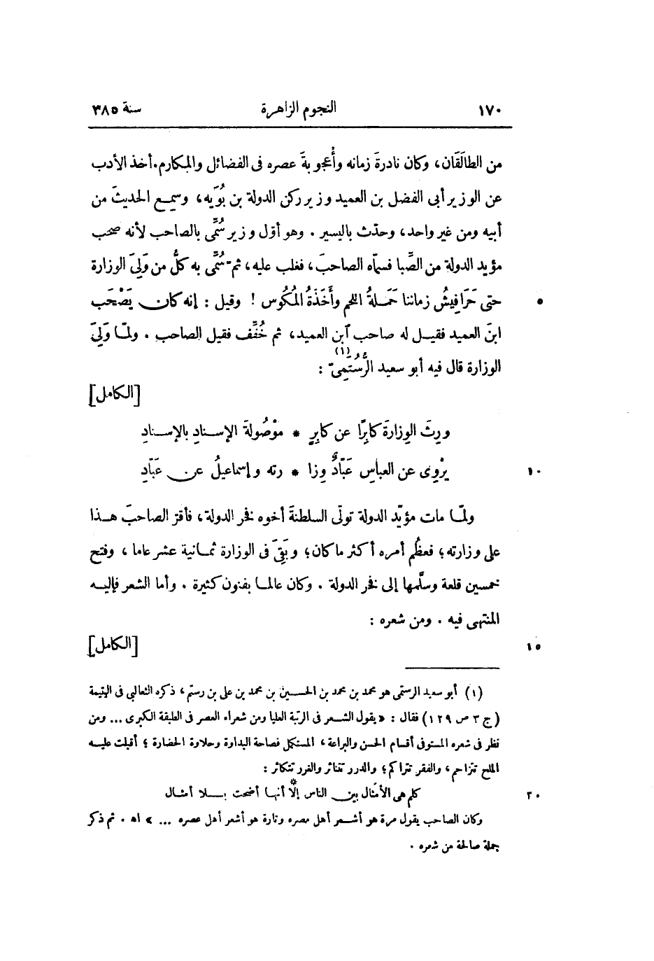 من الطالقان، وكان نادرة زمانه وأعجوبة عصره في الفضائل والمكارم. أخذ الأدب عن الوزير أبى الفضل بن العميد وزير ركن الدولة بن بويه، وسمع الحديث من أبيه ومن غير واحد، وحدّث باليسير. وهو أوّل وزير سمّى بالصاحب لأنه صحب مؤيد الدولة من الصّبا فسمّاه الصاحب، فغلب عليه، ثمّ سمّى به كلّ من ولى الوزارة حتى حرافيش زماننا حملة اللحم وأخذة المكوس! وقيل: إنه كان يصحب ابن العميد فقيل له صاحب ابن العميد، ثم خفّف فقيل الصاحب. ولمّا ولى الوزارة قال فيه أبو سعيد الرّستمىّ «1» :