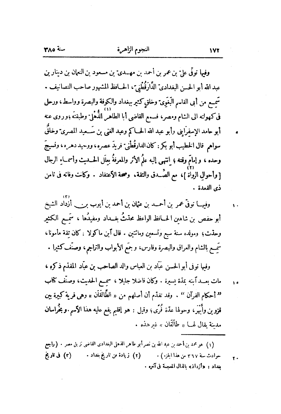 وفيها توفّى علىّ بن عمر بن أحمد بن مهدىّ بن مسعود بن النعمان بن دينار بن عبد الله أبو الحسن البغدادىّ الدّارقطنىّ، الحافظ المشهور صاحب التصانيف.