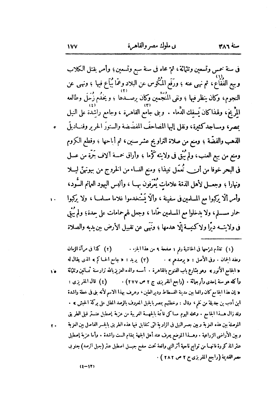 فى سنة خمس وتسعين وثلثمائة، ثمّ محاه في سنة سبع وتسعين؛ وأمر بقتل الكلاب وبيع الفقّاع «1» ، ثم نهى عنه؛ ورفع المكوس عن البلاد وعمّا يباع فيها؛ ونهى عن النجوم، وكان ينظر فيها؛ ونفى المنجّمين وكان يرصدها «2» ؛ ويخدم زحل وطالعه المرّيخ، ولهذا كان يسفك الدّماء. وبنى جامع «3» القاهرة، وجامع راشدة «4» على النيل بمصر، ومساجد كثيرة، ونقل إليها المصاحف المفضّضة والستور الحرير وقناديل الذهب والفضّة؛ ومنع من صلاة التراويح عشر سنين، ثم أباحها؛ وقطع الكروم ومنع من بيع العنب، ولم يبق في ولايته كرما؛ وأراق خمسة آلاف جرّة من عسل فى البحر خوفا من أن تعمل نبيذا؛ ومنع النساء من الخروج من بيوتهنّ ليلا ونهارا؛ وجعل لأهل الذمّة علامات يعرفون بها، وألبس اليهود العمائم السّود، وأمر ألّا يركبوا مع المسلمين في سفينة، وألّا يستخدموا غلاما مسلما، ولا يركبوا حمار مسلم، ولا يدخلوا مع المسلمين حمّاما، وجعل لهم حمامات على حدة؛ ولم يبق فى ولايته ديرا ولا كنيسة إلّا هدمها؛ ونهى عن تقبيل الأرض بين يديه والصلاة