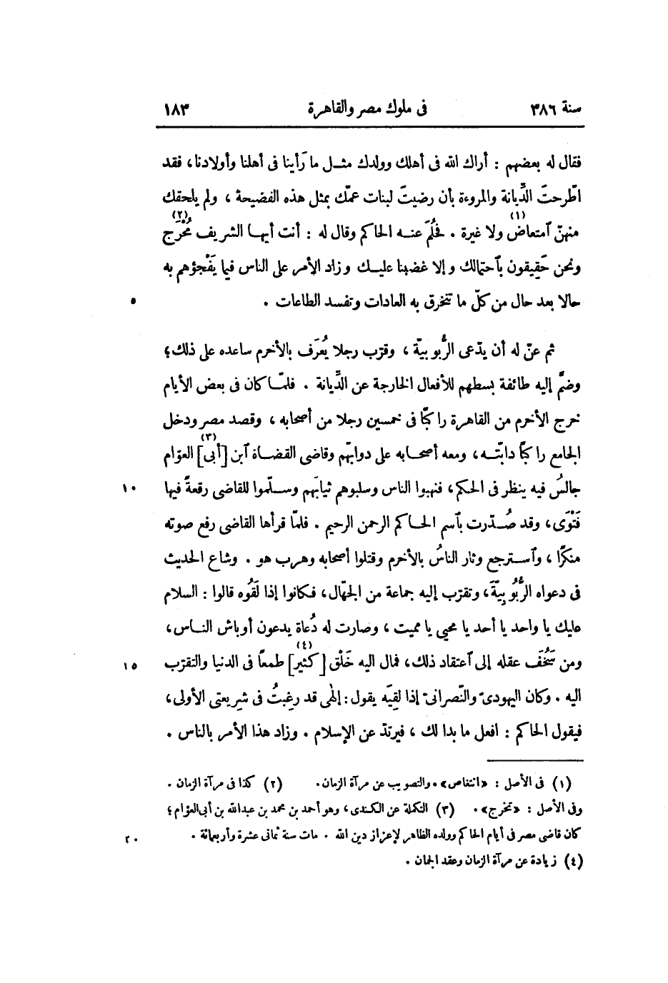 ثم عنّ له أن يدّعى الرّبوبيّة، وقرّب رجلا يعرف بالأخرم ساعده على ذلك؛ وضمّ إليه طائفة بسطهم للأفعال الخارجة عن الدّيانة. فلمّا كان في بعض الأيام خرج الأخرم من القاهرة راكبا في خمسين رجلا من أصحابه، وقصد مصر ودخل الجامع راكبا دابّته، ومعه أصحابه على دوابّهم وقاضى القضاة ابن [أبى «3» ] العوّام جالس فيه ينظر في الحكم، فنهبوا الناس وسلبوهم ثيابهم وسلّموا للقاضى رقعة فيها فتوى، وقد صدّرت باسم الحاكم الرّحمن الرّحيم. فلمّا قرأها القاضى رفع صوته منكرا، واسترجع وثار الناس بالأخرم وقتلوا أصحابه وهرب هو. وشاع الحديث فى دعواه الرّبوبيّة، وتقرّب إليه جماعة من الجهّال، فكانوا إذا لقوه قالوا: السلام عليك يا واحد يا أحد يا محيى يا مميت، وصارت له دعاة يدعون أوباش الناس، ومن سخف عقله إلى اعتقاد ذلك، فمال إليه خلق [كثير «4» ] طمعا في الدنيا والتقرّب اليه. وكان اليهودىّ والنّصرانىّ إذا لقيه يقول: إلهى قد رغبت في شريعتى الأولى، فيقول الحاكم: افعل ما بدا لك، فيرتدّ عن الإسلام. وزاد هذا الأمر بالناس.