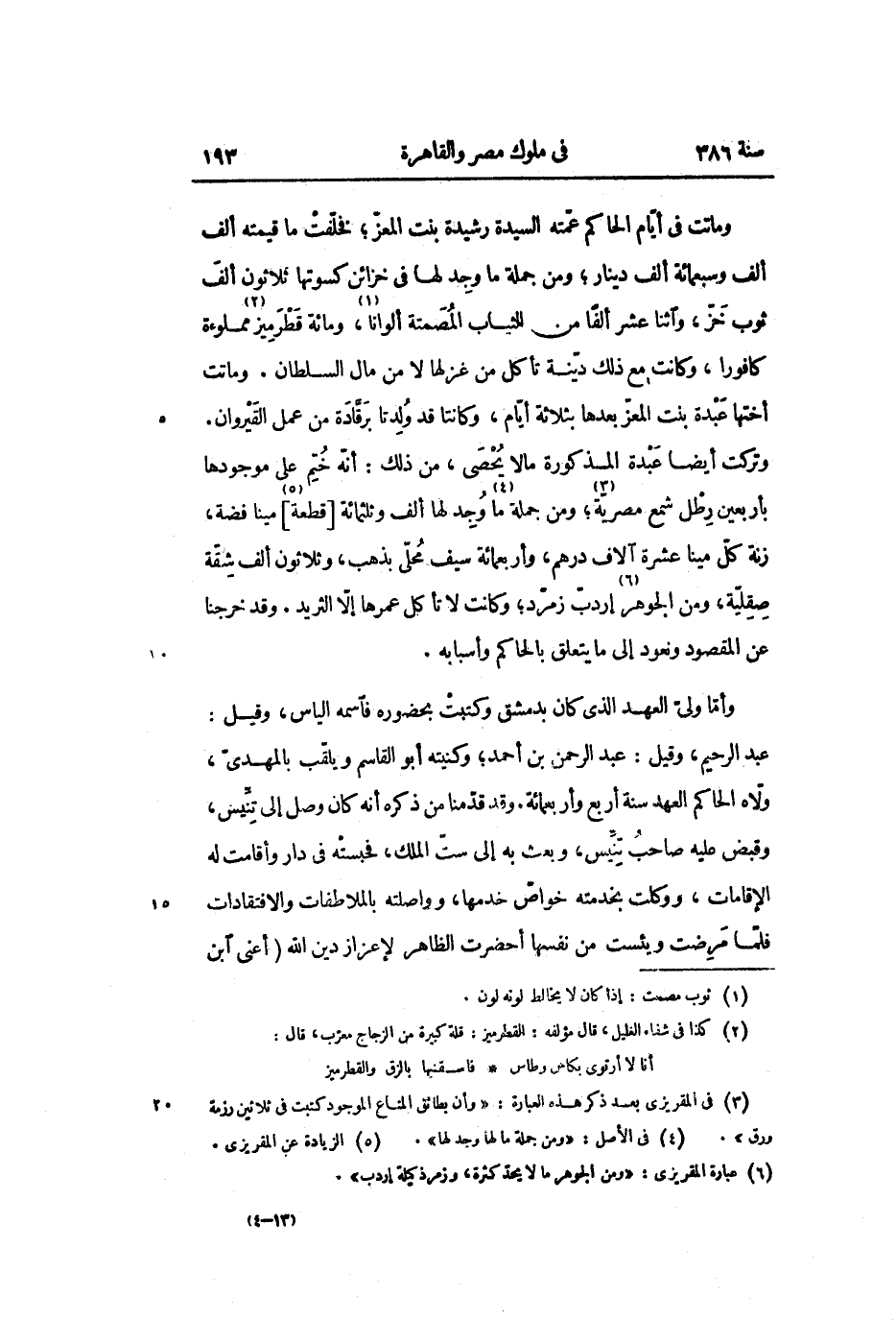وتركت أيضا عبدة المذكورة مالا يحصى، من ذلك: أنّه ختم على موجودها بأربعين رطل شمع مصريّة «3» ؛ ومن جملة «4» ما وجد لها ألف وثلثمائة [قطعة «5» ] مينا فضة، زنة كلّ مينا عشرة آلاف درهم، وأربعمائة سيف محلّى بذهب، وثلاثون ألف شقّة صقليّة، ومن الجوهر «6» اردبّ زمرّد؛ وكانت لا تأكل عمرها إلّا الثريد. وقد خرجنا عن المقصود ونعود إلى ما يتعلق بالحاكم وأسبابه.