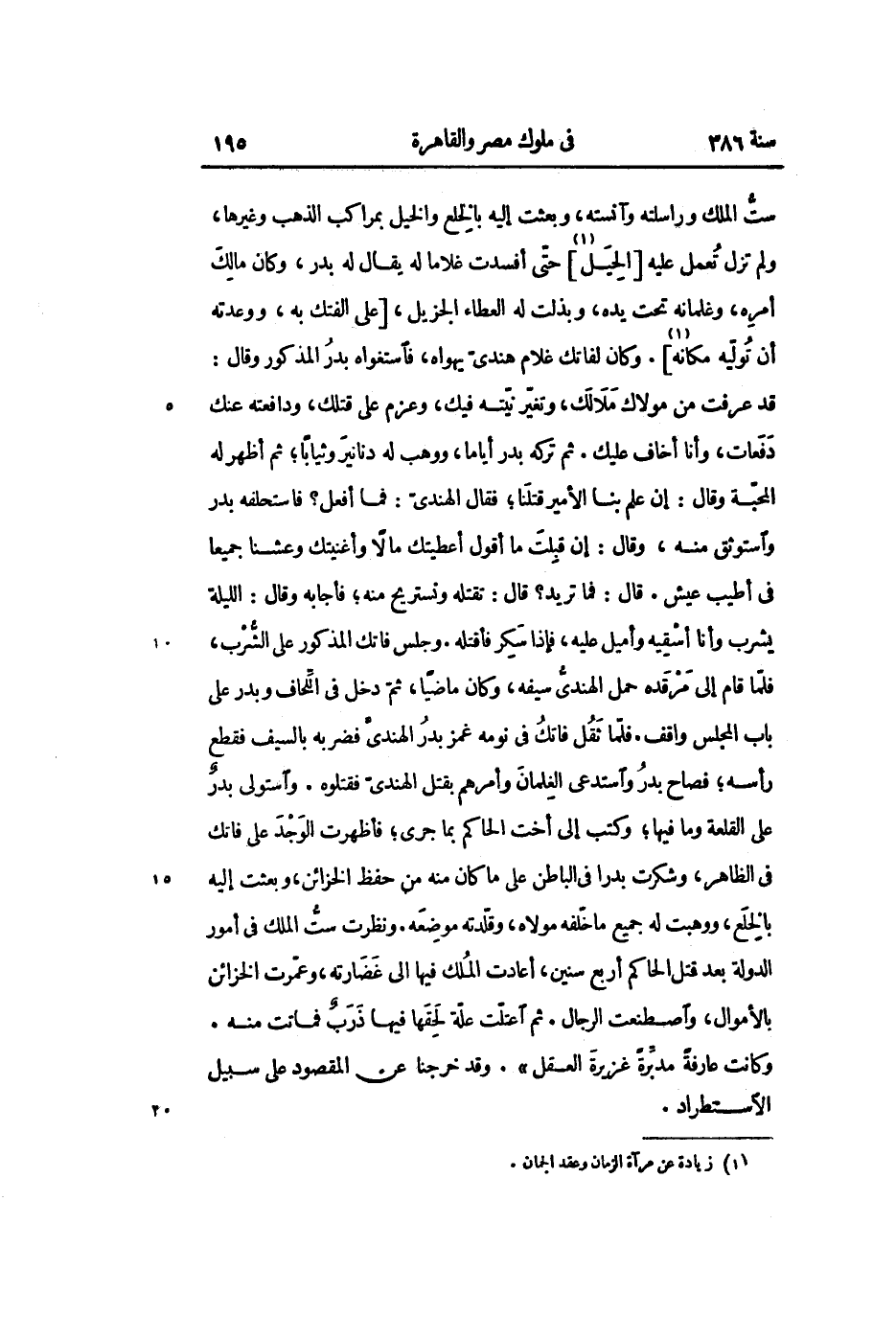ستّ الملك وراسلته وآنسته، وبعثت إليه بالخلع والخيل بمراكب الذهب وغيرها، ولم تزل تعمل عليه [الحيل «1» ] حتّى أفسدت غلاما له يقال له بدر، وكان مالك أمره، وغلمانه تحت يده، وبذلت له العطاء الجزيل، [على الفتك به، ووعدته أن تولّيه مكانه «2» ] . وكان لفاتك غلام هندىّ يهواه، فاستغواه بدر المذكور وقال: