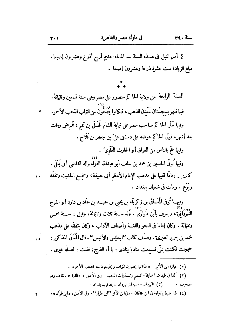 وفيها توفّى المعافى بن زكريّاء بن يحيى بن حميد بن حمّاد بن داود أبو الفرج النّهروانىّ «3» ، ويعرف بابن طرارى «4» . ولد سنة ثلاث وثلثمائة، وقيل: سنة خمس وثلثمائة. وكان إماما في النحو واللغة وأصناف الآداب، وكان يتفقّه على مذهب محمد بن جرير الطبرىّ. وصنّف كتاب" الجليس والأنيس". قال المعافى المذكور: