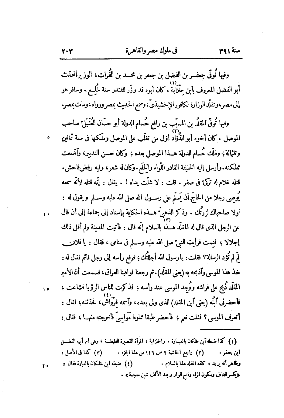 خذ هذا الموسى واذبحه به (يعنى المقلّد) . ثم رجعنا فوافينا العراق، فسمعت أنّ الأمير المقلّد ذبح على فراشه ووجد الموسى عند رأسه؛ فذكرت للناس الرؤيا فشاعت؛ فأحضرنى ابنه (يعنى ابن المقلد) الذي ولى بعده، واسمه قرواش «4» ، فحدّثته؛ فقال: