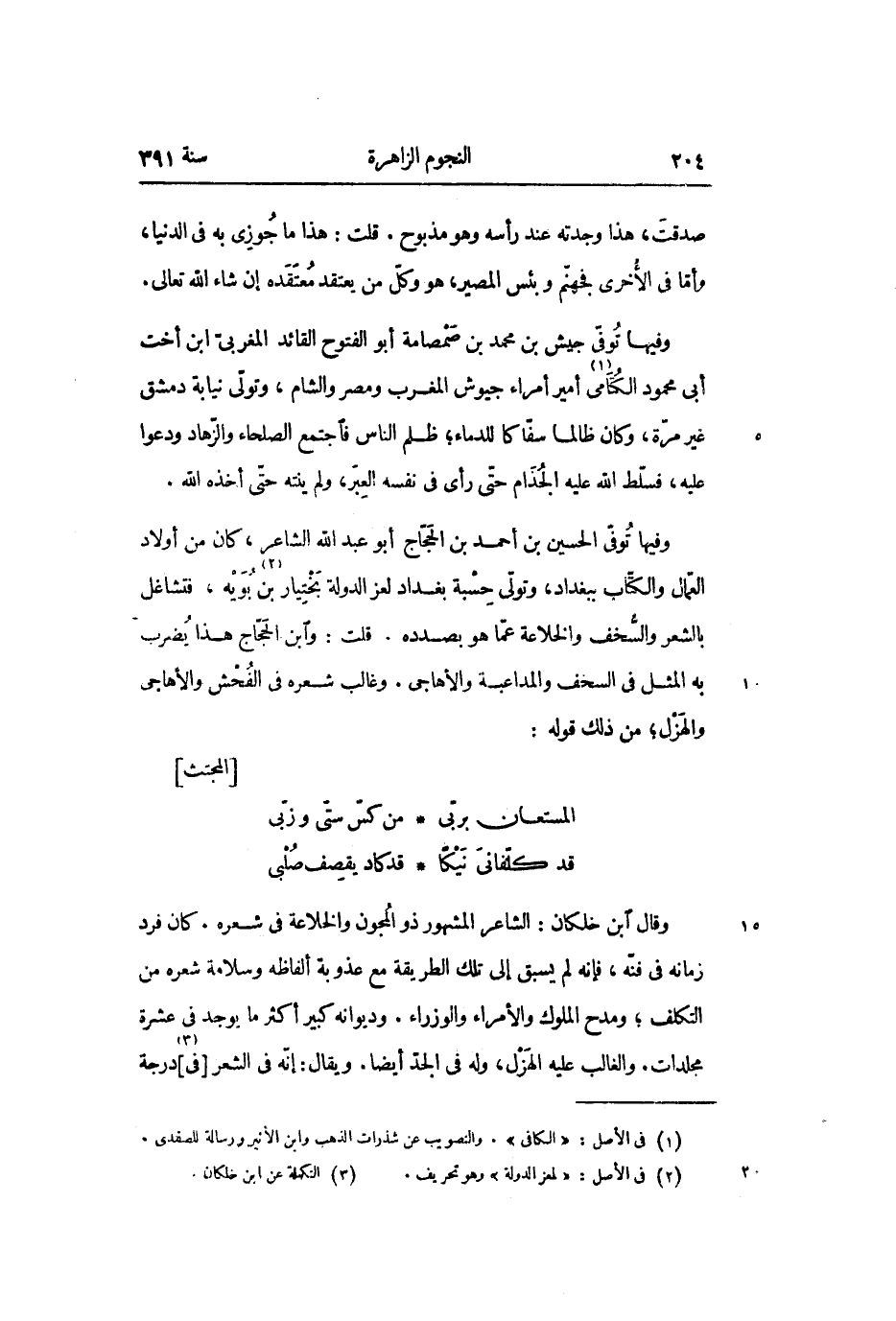 وفيها توفّى الحسين بن أحمد بن الحجّاج أبو عبد الله الشاعر، كان من أولاد العمّال والكتّاب ببغداد، وتولّى حسبة بغداد لعز الدولة بختيار بن «2» بويه، فتشاغل بالشعر والسّخف والخلاعة عمّا هو بصدده. قلت: وابن الحجّاج هذا يضرب به المثل في السخف والمداعبة والأهاجى. وغالب شعره في الفحش والأهاجى والهزل؛ من ذلك قوله: