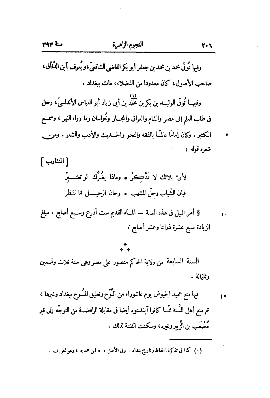 وفيها توفّى محمد بن محمد بن جعفر أبو بكر القاضى الشافعىّ، ويعرف بابن الدّقّاق، صاحب الأصول، كان معدودا من الفضلاء، مات ببغداد.