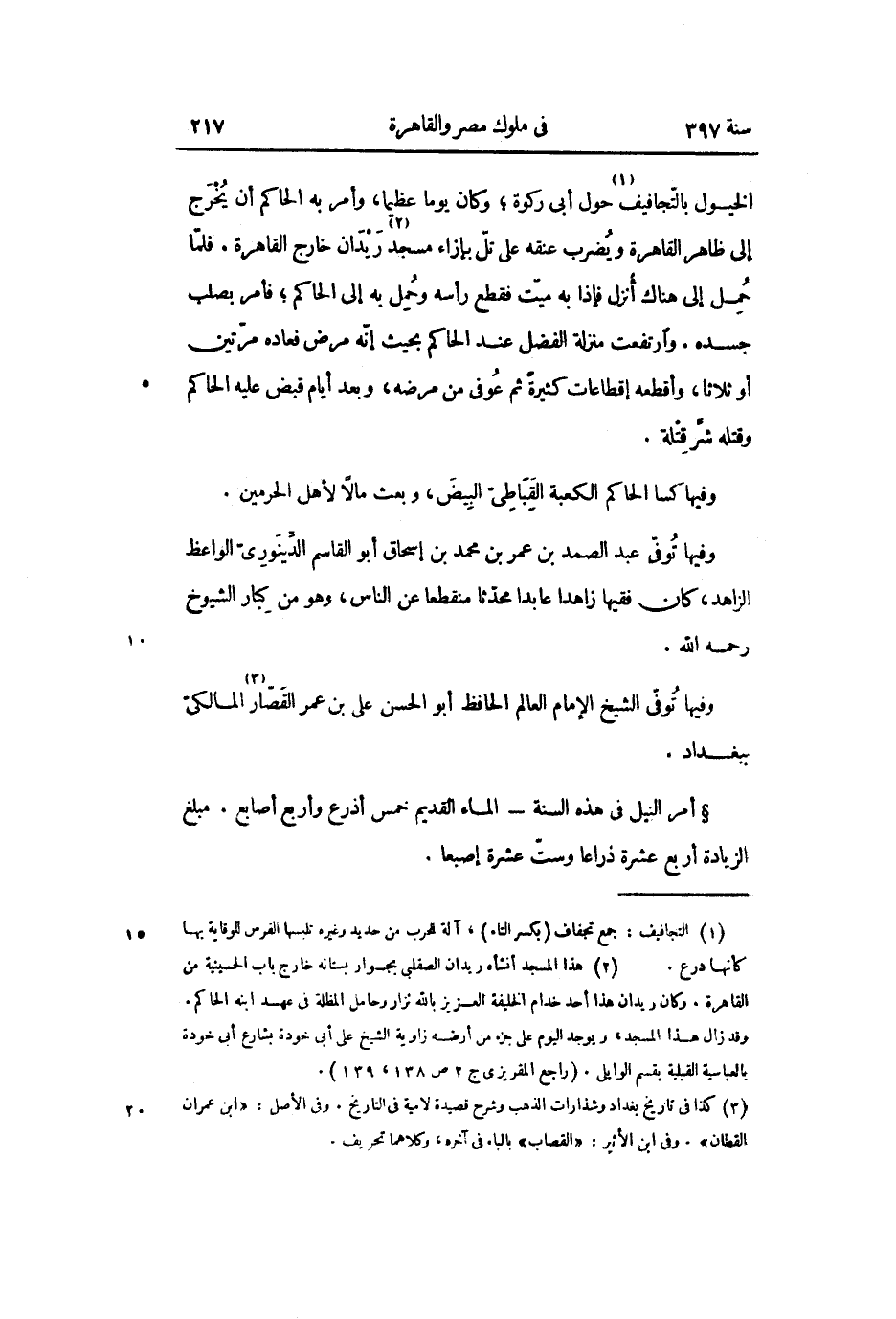 الخيول بالتّجافيف «1» حول أبى ركوة؛ وكان يوما عظيما، وأمر به الحاكم أن يخرج إلى ظاهر القاهرة ويضرب عنقه على تلّ بإزاء مسجد «2» ريدان خارج القاهرة. فلمّا حمل إلى هناك أنزل فإذا به ميّت فقطع رأسه وحمل به إلى الحاكم؛ فأمر بصلب جسده. وارتفعت منزلة الفضل عند الحاكم بحيث إنّه مرض فعاده مرّتين أو ثلاثا، وأقطعه إقطاعات كثيرة ثم عوفى من مرضه، وبعد أيام قبض عليه الحاكم وقتله شرّ قتلة.