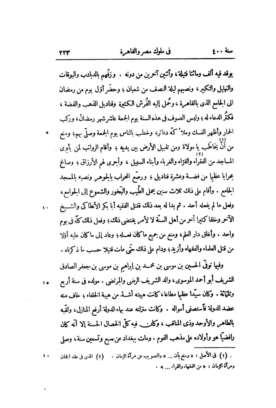 يوقد فيه ألف ومائتا فتيلة، واثنين آخرين من دونه. وزفّهم بالدبادب والبوقات والتهليل والتكبير، ونصبهم ليلة النصف من شعبان؛ وحضر أوّل يوم من رمضان الى الجامع الذي بالقاهرة، وحمل إليه الفرش الكثيرة وقناديل الذهب والفضة، فكثر الدعاء له؛ ولبس الصوف في هذه السنة يوم الجمعة عاشر شهر رمضان، وركب الحمار وأظهر النسك وملأ كمّه دفاتر، وخطب بالناس يوم الجمعة وصلّى بهم؛ ومنع من أن «1» يخاطب يا مولانا ومن تقبيل الأرض بين يديه؛ وأقام الرواتب لمن يأوى المساجد من الفقراء «2» والقرّاء والغرباء وأبناء السبيل، وأجرى لهم الأرزاق؛ وصاغ محرابا عظيما من فضة وعشرة قناديل؛ ورصّع المحراب بالجوهر ونصبه بالمسجد الجامع. وأقام على ذلك ثلاث سنين يحمل الطّيب والبخور والشموع إلى الجوامع، وفعل ما لم يفعله أحد. ثم بدا له بعد ذلك فقتل الفقيه أبا بكر الأنطاكى والشيخ الآخر وخلقا كثيرا أخر من أهل السنّة لا لأمر يقتضى ذلك؛ وفعل ذلك كلّه في يوم واحد. وأغلق دار العلم، ومنع من جميع ما كان فعله؛ وعاد إلى ما كان عليه أوّلا من قتل العلماء والفقهاء وأزيد؛ ودام على ذلك حتّى مات قتيلا حسب ما ذكرناه.