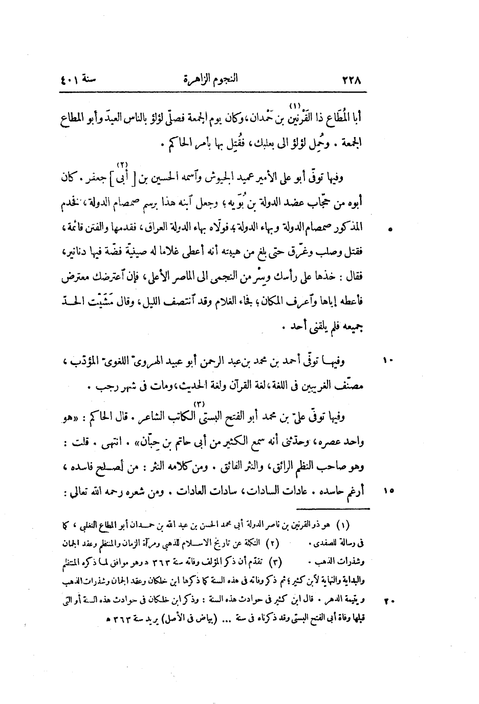 وفيها توفّى علىّ بن محمد أبو الفتح البستى «3» الكاتب الشاعر. قال الحاكم: «هو واحد عصره، وحدّثنى أنه سمع الكثير من أبى حاتم بن حبّان» . انتهى. قلت: