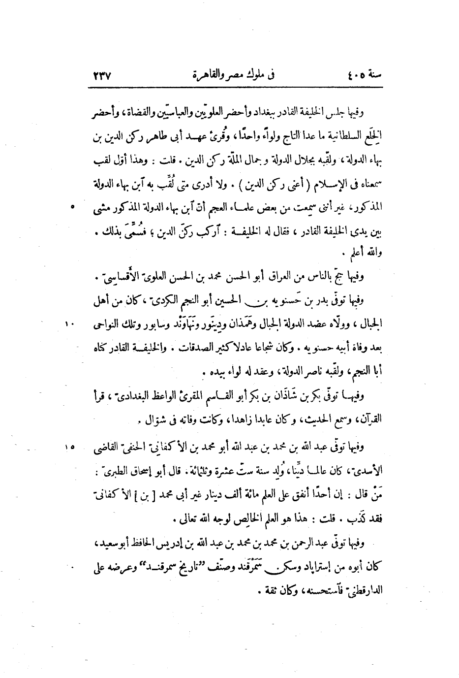وفيها جلس الخليفة القادر ببغداد وأحضر العلويّين والعباسيّين والقضاة، وأحضر الخلع السلطانية ما عدا التاج ولواء واحدا، وقرئ عهد أبى طاهر ركن الدين بن بهاء الدولة، ولقّبه بجلال الدولة وجمال الملّة ركن الدين. قلت: وهذا أوّل لقب سمعناه في الإسلام (أعنى ركن الدين) . ولا أدرى متى لقّب به ابن بهاء الدولة المذكور، غير أننى سمعت من بعض علماء العجم أنّ ابن بهاء الدولة المذكور مشى بين يدى الخليفة القادر، فقال له الخليفة: اركب ركن الدين؛ فسمّى بذلك.