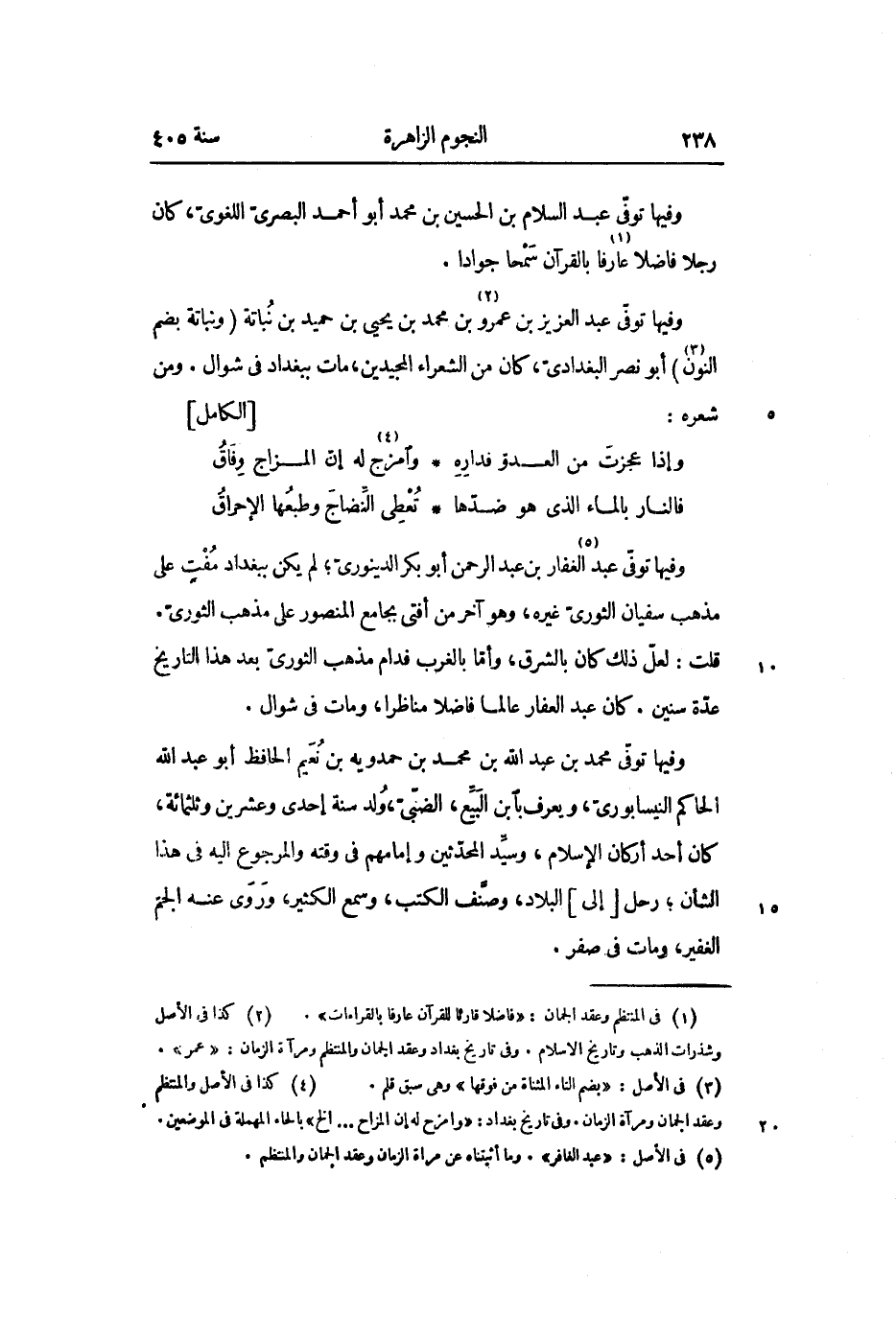 وفيها توفّى محمد بن عبد الله بن محمد بن حمدويه بن نعيم الحافظ أبو عبد الله الحاكم النيسابورىّ، ويعرف بابن البيّع، الضّبىّ، ولد سنة إحدى وعشرين وثلثمائة، كان أحد أركان الاسلام، وسيّد المحدّثين وإمامهم في وقته والمرجوع إليه في هذا الشأن؛ رحل [إلى] البلاد، وصنّف الكتب، وسمع الكثير، وروى عنه الجمّ الغفير، ومات في صفر.
