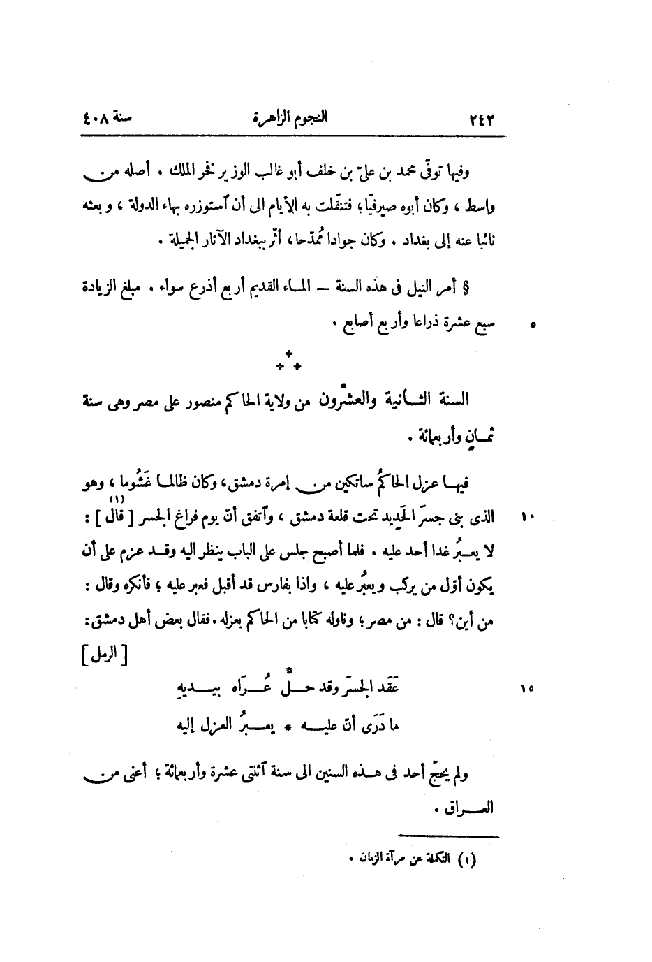 فيها عزل الحاكم ساتكين من إمرة دمشق، وكان ظالما غشوما، وهو الذي بنى جسر الحديد تحت قلعة دمشق، واتفق أنّ يوم فراغ الجسر [قال «1» ] :