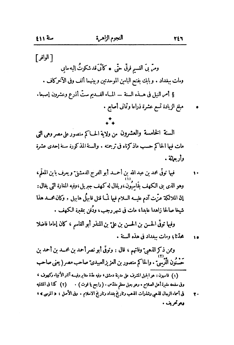 وممن ذكر الذهبىّ وفاتهم، قال: وتوفّى أبو نصر أحمد بن محمد بن أحمد بن حسنون النّرسىّ «2» . والحاكم منصور بن العزيز العبيدىّ صاحب مصر (يعنى صاحب