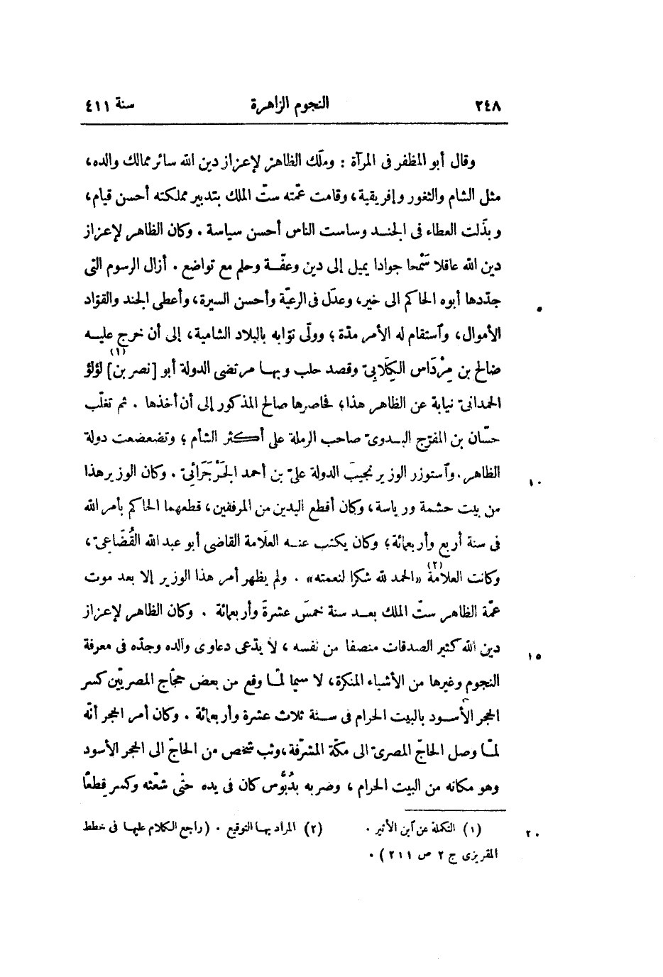 وقال أبو المظفر في المرآة: وملك الظاهر لإعزاز دين الله سائر ممالك والده، مثل الشام والثغور وإفريقية، وقامت عمّته ستّ الملك بتدبير مملكته أحسن قيام، وبذلت العطاء في الجند وساست الناس أحسن سياسة. وكان الظاهر لإعزاز دين الله عاقلا سمحا جوادا يميل إلى دين وعفّة وحلم مع تواضع. أزال الرسوم التى جدّدها أبوه الحاكم الى خير، وعدل في الرعيّة وأحسن السيرة، وأعطى الجند والقوّاد الأموال، واستقام له الأمر مدّة؛ وولّى نوّابه بالبلاد الشامية، إلى أن خرج عليه صالح بن مرداس الكلابىّ وقصد حلب وبها مرتضى الدولة أبو [نصر بن «1» ] لؤلؤ الحمدانىّ نيابة عن الظاهر هذا؛ فحاصرها صالح المذكور إلى أن أخذها. ثم تغلّب حسّان بن المفرّج البدوىّ صاحب الرملة على أكثر الشأم؛ وتضعضعت دولة الظاهر، واستوزر الوزير نجيب الدولة علىّ بن أحمد الجرجرائىّ. وكان الوزير هذا من بيت حشمة ورياسة، وكان أقطع اليدين من المرفقين، قطعهما الحاكم بأمر الله فى سنة أربع وأربعمائة؛ وكان يكتب عنه العلامة القاضى أبو عبد الله القضاعىّ، وكانت العلامة «2» «الحمد لله شكرا لنعمته» . ولم يظهر أمر هذا الوزير إلا بعد موت عمّة الظاهر ستّ الملك بعد سنة خمس عشرة وأربعمائة. وكان الظاهر لإعزاز دين الله كثير الصدقات منصفا من نفسه، لا يدّعى دعاوى والده وجدّه في معرفة النجوم وغيرها من الأشياء المنكرة، لا سيما لمّا وقع من بعض حجّاج المصريّين كسر الحجر الأسود بالبيت الحرام في سنة ثلاث عشرة وأربعمائة. وكان أمر الحجر أنّه لمّا وصل الحاجّ المصرىّ الى مكة المشرّفة، وثب شخص من الحاجّ الى الحجر الأسود وهو مكانه من البيت الحرام، وضربه بدبّوس كان في يده حتى شعثه وكسر قطعا