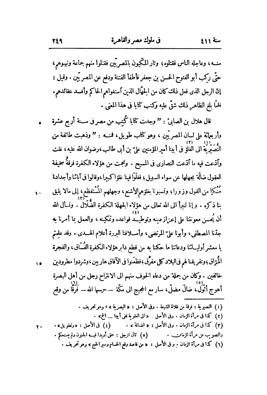 قال هلال بن الصابئ:" وجدت كتابا كتب من مصر في سنة أربع عشرة وأربعمائة على لسان المصريّين، وهو كتاب طويل، فمنه:" وذهبت طائفة من النّصيريّة «1» الى الغلوّ «2» فى أبينا أمير المؤمنين علىّ بن أبى طالب، رضوان الله عليه، غلت وادّعت فيه ما ادّعت النصارى في المسيح. ونجمت من هؤلاء الكفرة فرقة سخيفة العقول ضالّة بجهلها عن سواء السبيل؛ فغلوا فينا غلوّا كبيرا، وقالوا في آبائنا وأجدادنا منكرا من القول وزورا؛ ونسبونا بغلوّهم الأشنع، وجهلهم المستفظع، إلى ما لا يليق بنا ذكره. وإنا لنبرأ الى الله تعالى من هؤلاء الجهلة الكفرة الضّلّال «3» . ونسأل الله أن يحسن معونتنا على إعزاز دينه وتوطيد «4» قواعده وتمكينه، والعمل بما أمرنا به جدّنا المصطفى، وأبونا علىّ المرتضى، وأسلافنا البررة أعلام الهدى. وقد علمتم يا معشر أوليائنا ودعاتنا ما حكمنا به من قطع دابر هؤلاء الكفرة الفسّاق، والفجرة المرّاق؛ وتفريقنا لهم في البلاد كل مفرّق؛ فظعنوا في الآفاق هاربين، وشردوا مطرودين خائفين. وكان من جملة من دعاه الخوف منهم الى الانتزاح رجل من أهل البصرة أهوج أثول «5» ، ضالّ مضلّ، سار مع الحجيج الى مكّة- حرسها الله- فرقا «6» من وقع