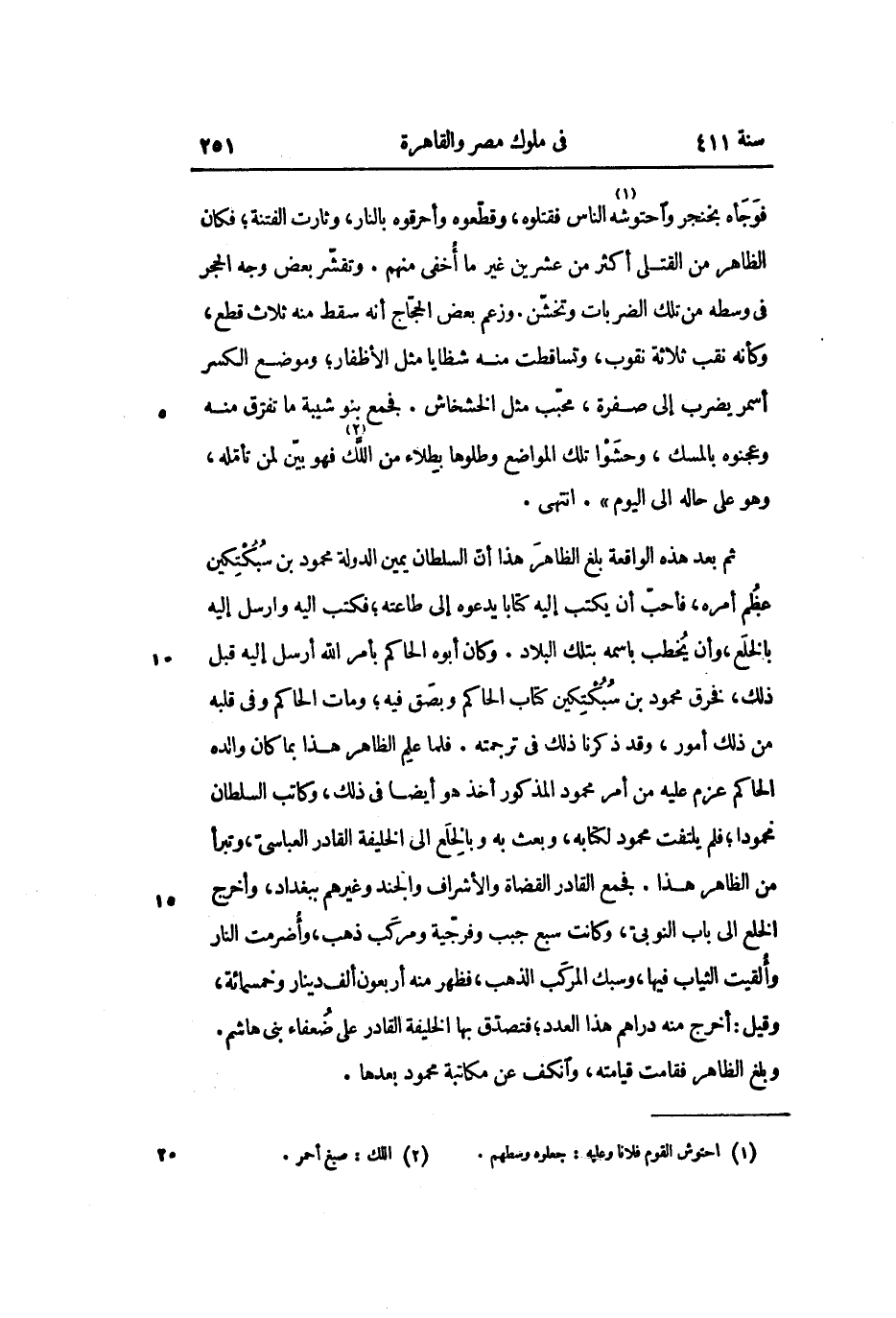 ثم بعد هذه الواقعة بلغ الظاهر هذا أنّ السلطان يمين الدولة محمود بن سبكتكين عظم أمره، فأحبّ أن يكتب إليه كتابا يدعوه إلى طاعته؛ فكتب إليه وارسل إليه بالخلع، وأن يخطب باسمه بتلك البلاد. وكان أبوه الحاكم بأمر الله أرسل إليه قبل ذلك، فخرق محمود بن سبكتكين كتاب الحاكم وبصق فيه؛ ومات الحاكم وفي قلبه من ذلك أمور، وقد ذكرنا ذلك في ترجمته. فلما علم الظاهر هذا بما كان والده الحاكم عزم عليه من أمر محمود المذكور أخذ هو أيضا في ذلك، وكاتب السلطان محمودا؛ فلم يلتفت محمود لكتابه، وبعث به وبالخلع الى الخليفة القادر العباسىّ، وتبرأ من الظاهر هذا. فجمع القادر القضاة والأشراف والجند وغيرهم ببغداد، وأخرج الخلع الى باب النوبىّ، وكانت سبع جبب وفرجّية ومركب ذهب، وأضرمت النار وألقيت الثياب فيها، وسبك المركب الذهب، فظهر منه أربعون ألف دينار وخمسائة، وقيل: أخرج منه دراهم هذا العدد؛ فتصدّق بها الخليفة القادر على ضعفاء بنى هاشم.