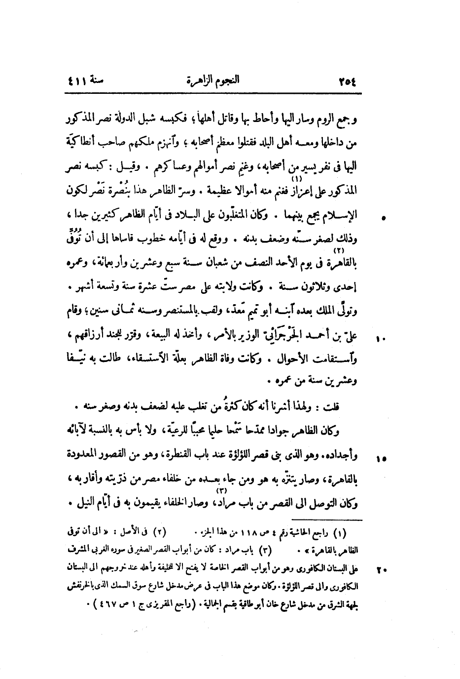 وجمع الروم وسار اليها وأحاط بها وقاتل أهلها؛ فكبسه شبل الدولة نصر المذكور من داخلها ومعه أهل البلد فقتلوا معظم أصحابه؛ وانهزم ملكهم صاحب أنطاكية اليها في نفر يسير من أصحابه، وغنم نصر أموالهم وعساكرهم. وقيل: كبسه نصر المذكور على إعزاز «1» فغنم منه أموالا عظيمة. وسرّ الظاهر هذا بنصرة نصر لكون الإسلام يجمع بينهما. وكان المتغلّبون على البلاد في أيّام الظاهر كثيرين جدا، وذلك لصغر سنّه وضعف بدنه. ووقع له في أيّامه خطوب قاساها إلى أن توفّى بالقاهرة «2» فى يوم الأحد النصف من شعبان سنة سبع وعشرين وأربعمائة، وعمره إحدى وثلاثون سنة. وكانت ولايته على مصر ستّ عشرة سنة وتسعة أشهر.