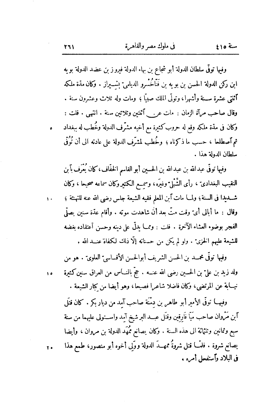 وفيها توفّى عبد الله بن عبد الله بن الحسين أبو القاسم الخفّاف، كان يعرف بابن النقيب البغدادىّ، رأى الشّبلىّ وغيره، وسمع الكثير وكان سماعه صحيحا، وكان شديدا في السنة؛ ولما مات ابن المعلم فقيه الشيعة جلس رضى الله عنه للتهنئة؛ وقال: ما أبالى أىّ وقت متّ بعد أن شاهدت موته. وأقام عدّة سنين يصلّى الفجر بوضوء العشاء الآخرة. قلت: ومما يدلّ على دينه وحسن اعتقاده بغضه للشيعة عليهم الخزىّ. ولو لم يكن من حسناته إلّا ذلك لكفاة عند الله.
