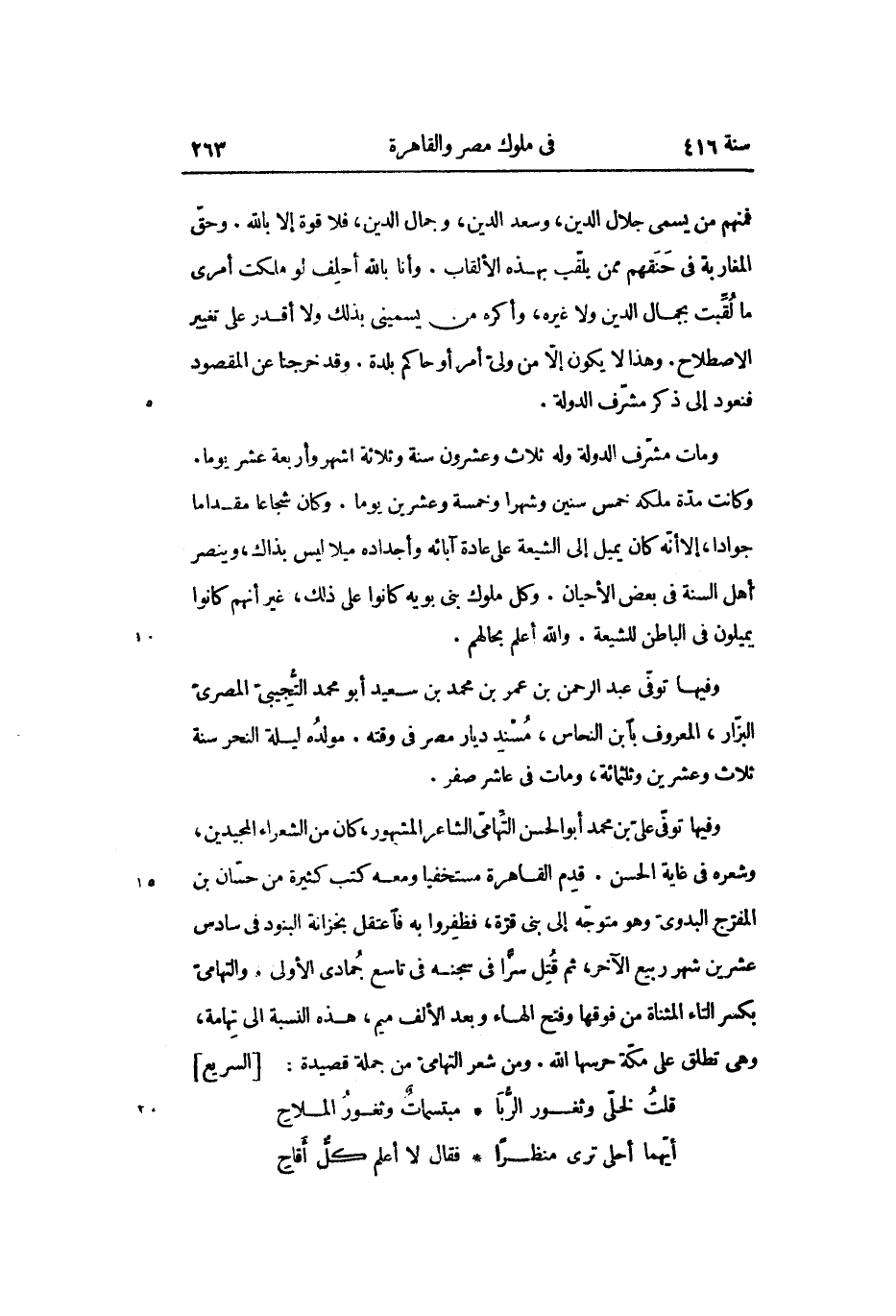 وفيها توفّى علىّ بن محمد أبو الحسن التّهامىّ الشاعر المشهور، كان من الشعراء المجيدين، وشعره في غاية الحسن. قدم القاهرة مستخفيا ومعه كتب كثيرة من حسّان بن المفرّج البدوىّ وهو متوجّه إلى بنى قرّة، فظفروا به فاعتقل بخزانة البنود في سادس عشرين شهر ربيع الآخر، ثم قتل سرّا في سجنه في تاسع جمادى الأولى. والتهامىّ بكسر التاء المثناة من فوقها وفتح الهاء وبعد الألف ميم، هذه النسبة الى تهامة، وهى تطلق على مكّة حرسها الله. ومن شعر التهامىّ من جملة قصيدة: [السريع]